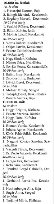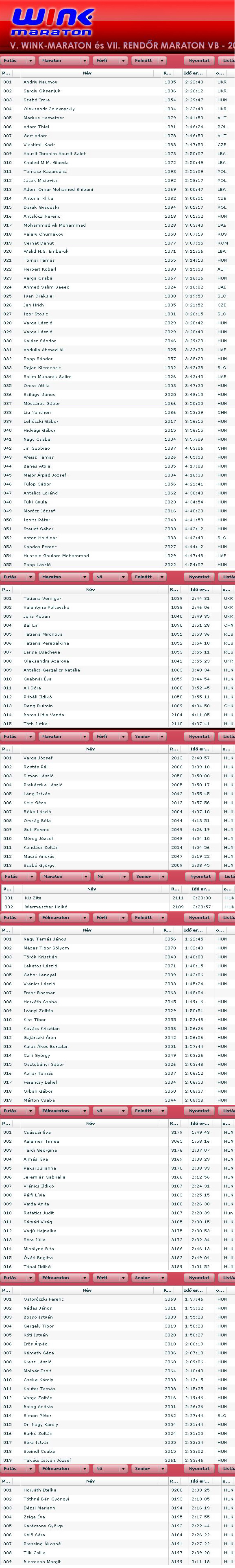 Január Jan. 05. Szigetfutás - Budapest - Margitsziget 5,3km. eredmények Jan. 06. Brembo maraton (5.) Bergamo / Italia 42km. eredmények Jan. 13. Szentendre cross - terepfutóverseny / Futapest 5-15km. eredmények Jan. 13. Várkúti Hegyifutó versenysorozat (15.) 2. 4-8-16km. eredmények Jan. 20. Classica della Madonnina utcai verseny(31.) - Italia 12km. eredmények Jan. 27. Etyek cross - terepfutóverseny / Futapest 5-15km. eredmények Jan. 28. Puccini félmaraton / Lago Puccini / Italia 21km. eredmények Február Feb. 02. Szigetfutás - Budapest - Margitsziget 5,3km. eredmények Feb. 03. Csikóváralja cross - terepfutóverseny / Futapest 5-15km. eredmények Feb. 03. Mezza maratona / Sorrento / Italia 21km. eredmények Feb. 10. San Benedetto maraton (6.) / Italia 42km. eredmények Feb. 10. Várkúti Hegyifutó versenysorozat (15.) 3. 4-8-16km. eredmények Feb. 17. Siracusa City maraton (9.) - Italia 42km. eredmények Feb. 17. Corriferrara / Ferrara / Italia 21km. eredmények Feb. 24. Sevilla maraton - utcai futóverseny / Spain 42km. eredmények Feb. 24. TerreVerdiane maraton (11.) / Italia 42km. eredmények Feb. 24. Domonyvölgy cross - terepfutóverseny / Futapest 4-12km. eredmények Március Már. 01. Szigetfutás - Budapest - Margitsziget 5,3km. eredmények Már. 01. Tatai Tankodrom Futóverseny (5.) 1,5-6km. eredmények Már. 02. Bükki kilátások (7.) terepfutás és túra 44km. eredmények Mar. 02. Barcelona maraton - utcai futóverseny/ Spain 42km. eredmények Mar. 02. Vácrátót cross terepfutóverseny / Futapest 12km. eredmények Mar. 09. Pécs - Harkány- országúti futóverseny 25km. eredmények Mar. 09. Ferrara maraton - országúti futóverseny / Italia 11-29-42km. eredmények Mar. 14. Dunamenti Szupermaraton - országúti futóverseny 150km. eredmények Mar. 16. Bp. mezei bajnokság / Polus center 6-10km. eredmények Mar. 16. Duna menti Zöldgömb futás / Vác 2-5-10-21km. eredmények Mar. 16. Roma maraton - utcai futóverseny / Italy 42km. eredmények Már. 24. Eged-hegyi Terepfutás 6-13,4km. eredmények Mar. 24. Prato félmaraton / Italy 21km. eredmények Mar.27-30.Balaton szupermaraton / BSI 212km. eredmények Mar. 28. Pozsony maraton - utcai futóverseny / Slovákia 42km. eredmények Mar. 29. Vásárhelyi félmaraton / Kecskemét 21km. eredmények Mar. 29. Praga Hervis félmaraton / Czech 21km. eredmények Mar. 29. 6 órás verseny / Veszprém 6ó eredmények Mar. 29. Győrújbarát crossfutás 14km. eredmények Mar. 30. Bonyhád - Bátaszék félmaraton 21km. eredmények Mar. 30. Monaco maraton / France 10-42km. eredmények Mar. 30. Verőce cross, Futapest terepfutóverseny 5-11km. eredmények Április Apr. 05. 100km országúti bajnokság és 50km-es verseny/Kisbér 100km. eredmények Apr. 05. 4. Sárvár-Fürdő félmaraton 21km. eredmények Ápr. 05. Szigetfutás - Budapest - Margitsziget 5,3km. eredmények Apr. 06. Tóparti Futóparti / Agárd 28km. eredmények Apr. 06. III. Vérteskozma futóverseny 5-15km. eredmények Apr. 06. Párizs maraton / France 42km. eredmények Apr. 12. Országos Mezei Bajnokság / Nadap 6-12km. eredmények Apr. 13. London maraton / England 42km. eredmények Apr. 13. Rotterdam maraton / Holland 42km. eredmények Apr. 13. Torino maraton / Italy 42km. eredmények Apr. 13. Linz maraton, félmaraton / Austria 21-42km. eredmények Apr. 13. Vivicitta Budapest / BSI 6,5-12km. eredmények Ápr. 19. Sülysápi futónap (2.) 10km. eredmények Apr. 19. Biatorbágy cross / Futapest 6-11km. eredmények Apr. 19. Panoráma futás / Sprint 12km. eredmények Apr. 20. Debrecen maraton / Oxigén 10-20-42km. eredmények Ápr. 20. Zürich maraton - Svájc 42km. eredmények Apr. 20. Napoly maraton - utcai futóverseny /Italy 42km. eredmények Apr. 21. Boston maraton - utcai futóverseny / USA 42km. eredmények Apr. 25. 50km de Romagna/castel Bolognese / Italy 50km. eredmények Apr. 27. Hegyvidék félmaraton. Normafa / BSI 21km. eredmények Apr. 27. Padova maraton utcai futóverseny / Italy 42km. eredmények Apr. 27. Bécs maraton / Austria 42km. eredmények Apr. 27. Hamburg maraton / Deutchland 42km. eredmények Apr. 27. Albertirsa félmaraton - országúti futóverseny 21km. eredmények Apr. 27. Madrid maraton utcai futóverseny / Spain 42km. eredmények Apr. 27. London maraton 42km. eredmények Május Maj. 01. Búzás János emlékverseny / Nyárlőrinc 4-10km. eredmények Maj. 01. II. Domaine Gróf Zichy futóverseny / Szekszárd 5-10km. eredmények Maj. 01. Riso maraton / Italy 42km. eredmények Maj. 03. Sárvári 12 és 24 órás Futás (7.) - R: Kinizsi SE 12-24ó. eredmények Máj. 03. Szigetfutás - Budapest - Margitsziget 5,3km. eredmények Maj. 03. Komárom - Komárno utcai futóverseny 11km. eredmények Maj. 04. Maconkai Tófutás - Bátonyterenye 6-14km. eredmények Maj. 04. Szigetközi Minimaraton - Mosonmagyaróvár - Strucc 4-16km. eredmények Maj. 04. Triest maraton / Italy 42km. eredmények Maj. 04. Düsseldorf maraton / Deutchland 42km. eredmények Maj. 04. Collemarathon / Italy 42km. eredmények Maj. 04. Félmaraton OB / Sajószentpéter 21km. eredmények Maj. 04. Salzburg maraton félmaraton / Austria 21-42km. eredmények Maj. 10. Bicske cross / Futapest 4-11km. eredmények Maj. 10. Kolon Kupa (1.) - Izsák 0,3-0,8-2,5-10km. eredmények Maj. 10. Montrail Bükk 60 /Terep Ultra Kupa Futam 58km. eredmények Maj. 11. Praga Volkswagen maraton / Czech 42km. eredmények Maj. 11. Pisa maraton / Italy 42km. eredmények Maj. 11. Verona maraton / Italy 42km. eredmények Maj. 17. Fétis crossfutás / Göd 14km. eredmények Maj. 17. 10.000m-es OB / MASZ 10km. eredmények Maj. 17. Wink maraton és félmaraton / Siófok 21-42km. eredmények Maj. 17. Decathlon crossfutás / Csillebérc 10km. eredmények Maj. 18. Horány félmaraton 21km. eredmények Maj. 18. Copenhagen maraton / Denmark 42km. eredmények Maj. 18. Tata tófutás /1 v. 2 kör/ 7-14km. eredmények Maj.24-25.Békéscsaba - Arad szupermaraton 200km. eredmények Maj. 24. Terep Száza