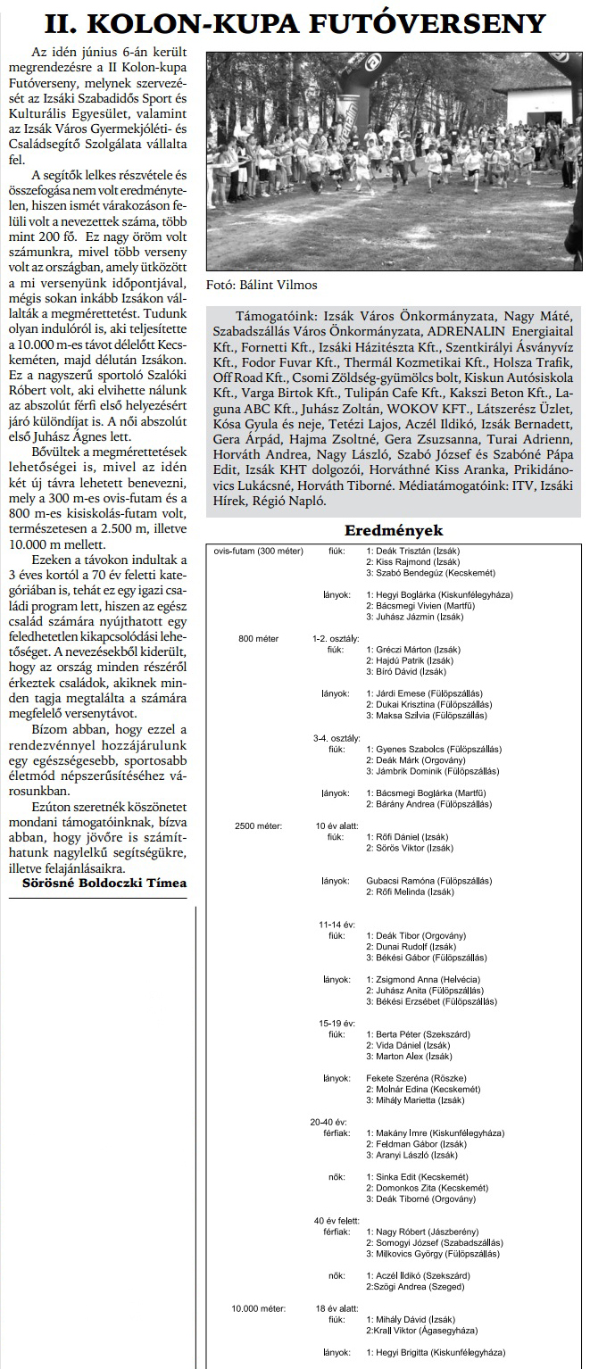 Január Jan. 04.vas. Szentendre cross - terepfutóverseny - Futapest 4-12km. eredmények Jan. 04.vas. Brembo maraton (6.) Bergamo - Italia 42km. eredmények Jan. 11.vas. Várkúti Hegyifutó versenysorozat (16.) 2. 4-8-16km. eredmények Jan. 17.szo. Oxigén Kupa - terepfutóverseny - Debrecen 10km. eredmények Jan. 18.vas. Szorospataki Hegyi Futóverseny - Bátonyterenye 7-12km. eredmények Jan. 18.vas. Puccini félmaraton - Lago Puccini - Italia 5-21km. eredmények Jan. 25.vas. Etyek cross - terepfutóverseny - Futapest 5-15km. eredmények Február Feb. 01.vas. Csikóváralja cross - terepfutóverseny - Futapest 5-15km. eredmények Feb. 01.vas. Maremonti félmaraton (10.) - Sorrento - Italia 21km. eredmények Feb. 07.szo. Margita terep maraton (3.) - Gödöllő - TUK 1.forduló 40km. eredmények Feb. 08.vas. San Benedetto maraton (7.) - Italia 42km. eredmények Feb. 14.szo. Oxigén Kupa - terepfutóverseny - Debrecen (korcs.) 5-10km. eredmények Feb. 15.vas. Siracusa City maraton - Italia 42km. eredmények Feb. 15.vas. Corriferrara - Ferrara félmaraton - Italia 21km. eredmények Feb. 15.vas. Várkúti Hegyifutó versenysorozat (16.) 3. 4-8-16km. eredmények Feb. 22.vas. Domonyvölgy cross - terepfutóverseny - Futapest 4-12km. eredmények Feb. 22.vas. Sevilla maraton - Spain 42km. eredmények Március Már. 01.vas. Bükki kilátások (8.) terepfutás és túra 44km. eredmények Mar. 01.vas. Göcsej Terep ultramaraton - Göcsej - TUK 2.forduló 50km. eredmények Mar. 01.vas. Vácrátót cross terepfutóverseny - Futapest 4-12km. eredmények Már. 01.vas. Tatai Tankodrom Futóverseny (6.) 1,5-6km. eredmények Mar. 01.vas. Barcelona maraton - Spain 42km. eredmények Már. 07.-08. Tájfutó maraton - Várpalota 42km. eredmények Mar. 08.vas. Pécs - Harkány - országúti futóverseny (korcs.) 25km. eredmények Mar. 08.vas. Ferrara maraton - országúti futóverseny - Italia 11-29-42km. eredmények Mar. 08.vas. Megalódusz hegyi futóverseny - Tatabánya 3-6-11km. eredmények Mar. 13.-15. Duna menti Zöldgömb futás - Vác (korcs.) 2-5-10-21km. eredmények Mar. 15.vas. Bonyhád - Bátaszék félmaraton 21km. eredmények Mar. 15.vas. Népek Tavasza 42 terepfutóverseny - Miskolc 42km. eredmények Mar. 19.-22. Balaton szupermaraton - BSI 212km. eredmények Mar. 21.szo. 6 órás verseny - Veszprém 6 ó. eredmények Mar. 21.szo. Sárvár-fürdő félmaraton (6.) 21km. eredmények Már. 23.vas. Eged-hegyi Terepfutás 6-13,4km. eredmények Mar. 22.vas. Roma maraton - Italia 42km. eredmények Mar. 22.vas. Monaco maraton - France 10-42km. eredmények Mar. 28.szo. Praga Hervis félmaraton - Czech 21km. eredmények Mar. 28.szo. Vásárhelyi félmaraton - Kecskemét (korcs.) 10-21km. eredmények Mar. 28.szo. 7. Treviso maraton - Italia 42km. eredmények Mar. 29.vas. Pozsony maraton - utcai futóverseny - Slovákia 42km. eredmények Mar. 29.vas. Győrújbarát crossfutás 14km. eredmények Mar. 29.vas. Verőce cross, Futapest terepfutóverseny 5-11km. eredmények Mar. 29.vas. Sri Chinmoy félmaraton, maraton - Pécs 21-42km. eredmények Mar. 29.vas. IV. Vérteskozma futóverseny 5-15km. eredmények Mar. 29.vas. Dunaparti futóparti - 1. futam - Esztergom 4-10km. eredmények Április Ápr. 04.szo. Hegyalja félmaraton OB - Szerencs (korcsoportos) 21km. eredmények Ápr. 04.szo. 100km-es bajnokág - Kisbér 100km. eredmények Ápr. 05.vas. Tessedik félmaraton (8.)- Albertirsa (korcsoportos) 21km. eredmények Ápr. 05.vas. Tóparti Futóparti - Agárd 28km. eredmények Ápr. 05.vas. Rotterdam maraton - Holland 42km. eredmények Ápr. 05.vas. Párizs maraton - France 42km. eredmények Ápr. 13.vas. Prato város félmaraton - Italia 21km. eredmények Ápr. 18.szo. Biatorbágy cross - Futapest 6-11km. eredmények Ápr. 19.vas. Torino maraton - Italia 42km. eredmények Ápr. 19.vas. Bécs maraton - Austria 42km. eredmények Ápr. 19.vas. Vivicitta - Budapest 12km. eredmények Ápr. 20.hét. Boston maraton - utcai futóverseny - USA 42km. eredmények Ápr. 24.pén. Zenthe Ferenc Emlékfutás (1.) Salgótarján/Salgóbánya 2-4-6km. eredmények Ápr. 25.-26. Sárvári 12 és 24 órás Futás (8.) - R: Kinizsi SE 12-24ó. eredmények Ápr. 26.vas. London maraton - England 42km. eredmények Ápr. 26.vas. Hamburg maraton - Deutchland 42km. eredmények Ápr. 26.vas. Madrid maraton - utcai futóverseny - Spain 42km. eredmények Ápr. 26.vas. Zürich maraton - Svájc 42km. eredmények Május Maj. 02.szo. Börzsöny ultra - TUK 3. forduló - Börzsöny 44km. eredmények Maj. 02.szo. III. Domaine Gróf Zichy utcai futóverseny - Szekszárd 5-10km. eredmények Maj. 02.szo. X. Búzás János emlékverseny - Nyárlőrinc 3-10km. eredmények Maj. 02.szo. Tihanyi futóverseny - Aktivbalaton 5-10km. eredmények Maj. 03.vas. Szigetközi Minimaraton - Mosonmagyaróvár - Strucc 4-16km. eredmények Maj. 03.vas. Düsseldorf maraton - Deutchland 42km. eredmények Maj. 03.vas. Dunavarsány félmaraton (korcsoportos) 4-21km. eredmények Maj. 03.vas. Salzburg maraton, félmaraton - Austria 21-42km. eredmények Maj. 03.vas. Triest maraton - Italia 42km. eredmények Maj. 09.szo. 10.000m-es bajnokság - Tiszaújváros 10km. eredmények Maj. 09.szo. Bicske cross - Futapest 4-11km. eredmények Maj. 09.szo. Montrail Bükki 60 - TUK 4. forduló 55km. eredmények Maj. 10.vas. Sülysápi futónap (3.) 10km. eredmények Maj. 10.vas. Panoráma futás - Sprint (korcsoportos) 5-13km. eredmények Maj. 10.vas. Praga Volkswagen maraton - Czech 42km. eredmények Maj. 10.vas. Verona maraton - Italy 42km. eredmények Maj. 10.vas. CSEFUSZ futóverseny - Csepel 10km. eredmények Maj. 10.vas. Eszmefuttatás - Csillebérc - ESzME 5-10km. eredmények Maj. 10.vas. Mátra 115 -> Gyöngyöstarján 55-88-115km. eredmények Maj. 16.szo. Terep százas (4.) - Pesthidegkút 93-104km. eredmények Maj. 16.szo. Tárnoki Tófutás (5.) 6,5-13km. eredmények Maj. 16.szo. Wink maraton és félmaraton - Siófok (korcs.) 21-42km. eredmények Máj. 17.vas. Várfürdő 
