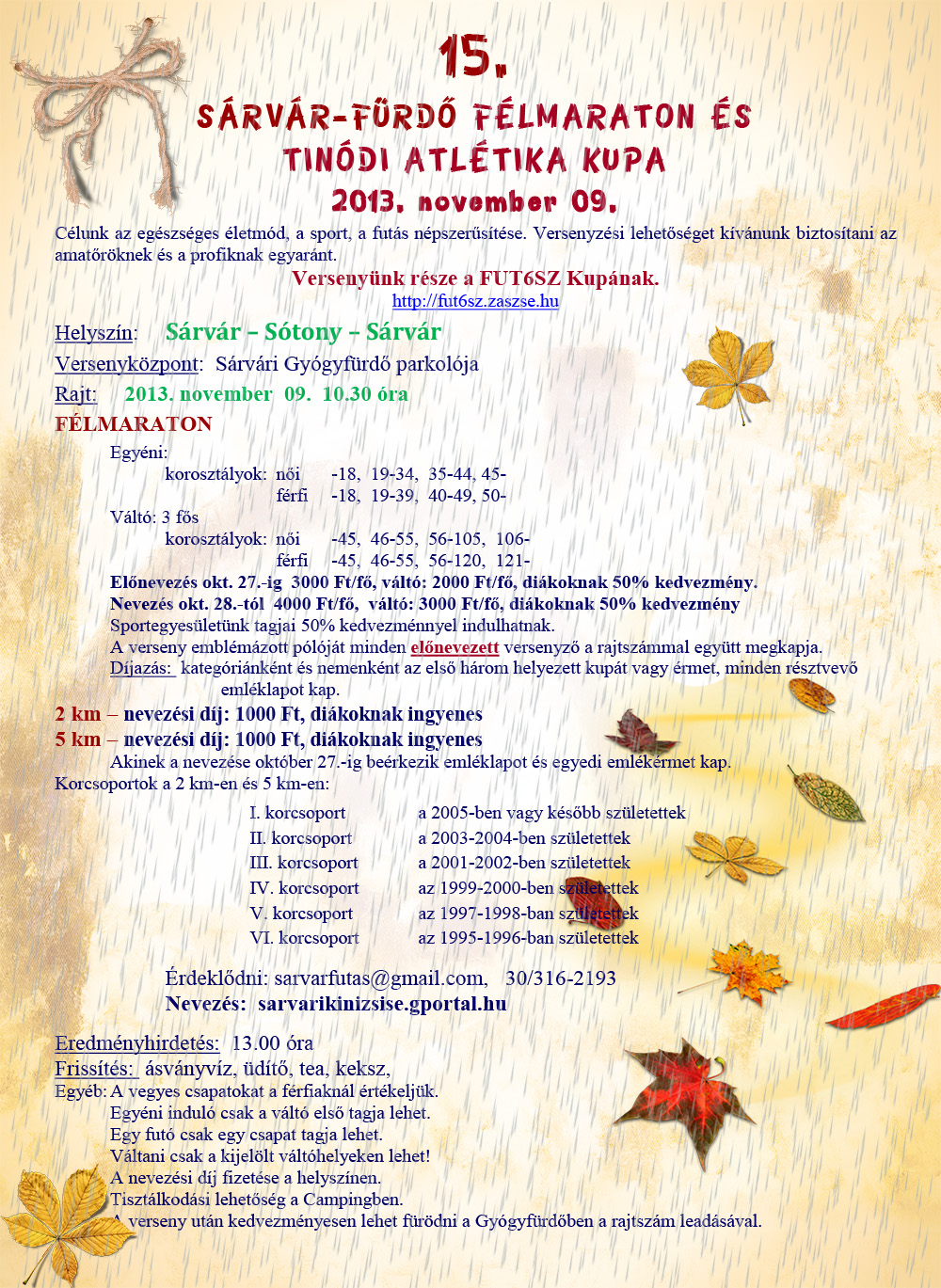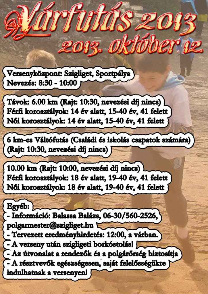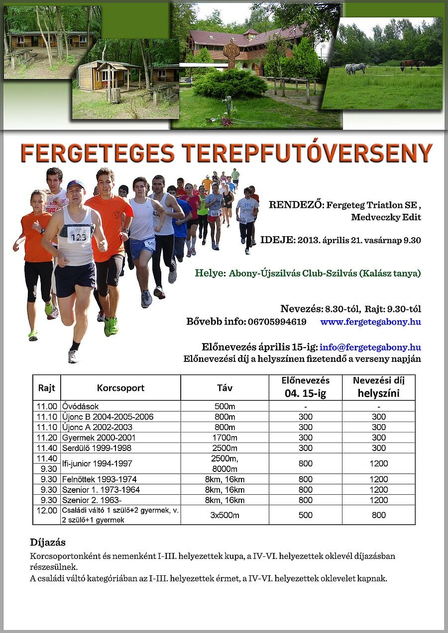 Január 01.hét Jan.01.ked. Új Évi Futás - Debrecen - Nagyerdő 5,5km. kiírás nem mért Jan.05.szo. Oxigén Kupa - terepfutóverseny - Debrecen - R: Oxigen (korosztályos) 1,5-2,5-5-10km. kiírás eredmények Jan.05.szo. Szigetfutás - Budapest - Margitsziget 5km. kiírás eredmények Jan.06.vas. Gútai vízkereszt maraton (3.) és félmaraton - Szlovákia 21-42k. kiírás eredmények 02.hét Jan.12.szo. Mura Kupa futóversenyt (2.) - Murakeresztúr 6-12-21km. kiírás eredmények Jan.13.vas. Szentendre crossfutás - R: Futapest 4-12km. kiírás eredmények Jan.13.vas. Várkúti hegyifutó versenysorozat (20.) - 2. forduló - R: Egri Spartacus SE 4-8-16km. kiírás eredmények 03.hét 04.hét Jan.27.vas. Etyek cross - R: Futapest 5-13km. kiírás eredmények Jan.27.vas. Siracusa City maraton (14.)- országúti futóverseny - Italia 10-21-42km. kiírás eredmények Február 05.hét Feb.02.szo. Szigetfutás - Budapest - Margitsziget 5km. kiírás eredmények Feb.02.szo. Domb futás - Kecskemét - R: Iustitia SE 0,8-3,5-7km. kiírás eredmények Feb.02.szo. Erdei Futóverseny - Szombathely - R: Göcsej KTFE 3-10km. kiírás eredmények Feb.03.vas. Kaposvár Dombjai Félmaraton (3.) - egyéni és váltófutás (korosztályos) 21km. kiírás eredmények 06.hét Feb.09.szo. Margita Terep Maraton (7.)- Gödöllő - R: Margita 344,2 21-44km. kiírás eredmények Feb.10.vas. Csikóváralja cross - terepfutóverseny - Pomáz - R: Futapest 6-12km. kiírás eredmények Feb.10.vas. Várkúti hegyifutó versenysorozat (20.) - 3. forduló - R: Egri Spartacus SE 4-8-16km. kiírás eredmények 07.hét Feb.16.szo. Oxigén Kupa - terepfutóverseny - Debrecen - R: Oxigen (korosztályos) 1,5-2,5-5-10km. kiírás eredmények 08.hét Feb.23.szo. Négy évszak maraton - Pusztaszabolcs - R: PSZE 10km. kiírás eredmények Feb.23.szo. Latyakfutás (9.) - Bogács - R: TTF SE 14km. kiírás eredmények Feb.24.vas. Tövis cross - terepfutóverseny (9.) - Domonyvölgy - R: Futapest 4-13km. kiírás eredmények Feb.24.vas. Erdei Futóverseny - Szombathely - R: Göcsej KTFE 3-10km. kiírás eredmények Feb.24.vas. Sevilla maraton (29.) - utcai futóverseny - Spain (pénzdíjas) 42km. kiírás eredmények Március 09.hét Már.02.szo. Oxigén Kupa - terepfutóverseny - Debrecen - R: Oxigen (korosztályos) 1,5-2,5-5-10km. kiírás eredmények Már.02.szo. Szigetfutás - Budapest - Margitsziget 5km. kiírás eredmények Már.02.szo. Tron Születésnapi Félmaraton (6.) - Palics 5-21km. kiírás eredmények Már.03.vas. Bükki kilátások (12.) terepfutás - Felsőtárkány - R: Egri Spartacus SE 44-66km. kiírás eredmények Már.03.vas. Pécs - Harkány - országúti futóverseny (29.) - R: PVSK (korosztályos, pénzdíjas)) 25km. kiírás eredmények Már.03.vas. Göcseji Galopp - Kávás - R: Göcsej KTFE 16-55km. kiírás eredmények Már.03.vas. Treviso maraton (10.) - utcai futóverseny - Italia 42km. kiírás eredmények 10. héi Már.09.szo. Tavaszváró Terepfutóverseny a Naplás Tónál - Budapest - R: MAHFuSZ 1-2-11km. kiírás eredmények Már.09.szo. OptiVita Ultrafutó Kupa - Székesfehérvár R: IronTeam 1-2-4-6-12ó. kiírás eredmények Már 09.szo. Péti Schmidt Ferenc Terepfutóverseny (43.) - Pétfürdő 0,5-3-5-10km. kiírás eredmények Már.10.vas. Duna menti Zöldsport Fesztivál - Vác - R: Zöldgömb (korosztályos) 2-5-10-21-30-42km. kiírás eredmények 11.hét Már.16.szo. Vácrátót cross sík, homokos terepen (14.) - R: Futapest 4-12km. kiírás eredmények Már.16.szo. PILIS VERTIKAL (8.) - Pilisszántó - R: MVTE - facebook ~ HEGYIFUTAS.HU 6,5km. kiírás eredmények Már.16.szo. Pilis-vörös-vár Terepfutó verseny 38km. kiírás eredmények Már.16.szo. Auriga Erdei Futóverseny - Szolnok 0,2-1,6-3-5,5-11km. kiírás eredmények Már.17.vas. Dunaparti Futópartik - 1. forduló - aszfaltos töltésen - Esztergom 0,5-4-10km. kiírás eredmények Már.17.vas. Eged-hegyi Terepfutás 6-13,4km. kiírás eredmények Már.17.vas. Roma maraton (19.) - utcai futóverseny - Italia 42km. kiírás eredmények Már.17.vas. Barcelona maraton (13.) - utcai futóverseny - Spain 42km. kiírás eredmények 12.hét Már.21-24. Balaton szupermaraton - R: BSI 195km. kiírás eredmények Már.22.pén. TTA Mezei Futóajnokság (7.) - Tápiószecső - R: TTA 1-2-3km. kiírás eredmények Már.23.szo. Vásárhelyi Családi Futófesztivál (19.) utcákon - Kecskemét (koroszt.) 0,6-1-3-5-10-21km. kiírás eredmények Már.23.szo. Gazdagréti Tavaszindító Futóverseny - R: Gyaloggalopp 0,5-1-2,5-5-10km. kiírás eredmények Már.24.vas. Rotary Debrecen félmaraton - maraton (3.) -utcákon - Debrecen 10,5-21-42km. kiírás eredmények Már.24.vas. Ferrara maraton - félmaraton - utcai futóverseny - Italia 21-42km. kiírás eredmények Már.24.vas. Novi Sad félmaraton (20.) - Szerbia 10-21km. kiírás eredmények 13.hét Már.30.szo. Rákoscsabai Terepfutás - R: Koren Tamás 4-12-21km. kiírás eredmények Már.30.szo. Sárvár-fürdő félmaraton (14.) - R: Sárvári Kinizsi SE 21km. kiírás eredmények Már.30.szo. Bonyhád - Bátaszék - szintes országúti - Félmaraton (korosztályos) 24km. kiírás eredmények Már.31.vas. Tatai Téli Tamkodrom crossfutás (10.) - Tata, Bakodi tó - R: TTT-HSE 1-4-5,1km. kiírás elmaradt!! Április 14.hét Ápr.06.szo. Pólus Futónap - Budapest Nyílt Mezei Futóbajnokság - Pólus Center 1,4-3-4-6-8km. kiírás eredmények Ápr.06.szo. Szigetfutás - Budapest - Margitsziget 5km. kiírás eredmények Ápr.06.szo. Herceghalmi Terepfutás - R: Gyaloggalopp 0,5-1-5-14km. kiírás eredmények Ápr.06.szo. Győrújbarát crossfutás (18.) - R: GyMS Megyei Szövetség 1-4-7-14km. kiírás eredmények Ápr.06.szo. Domb futás - Kecskemét - R: Iustitia SE 0,8-3,5-7km. kiírás eredmények Ápr.06.szo. Kisbéri 100 és 50km-es futóverseny - R: Unix SE 50-100km. kiírás eredmények Ápr.06.szo. Mérőmaraton Futóverseny (1.) - Kaposmérő 7-21km. kiírás eredmények 