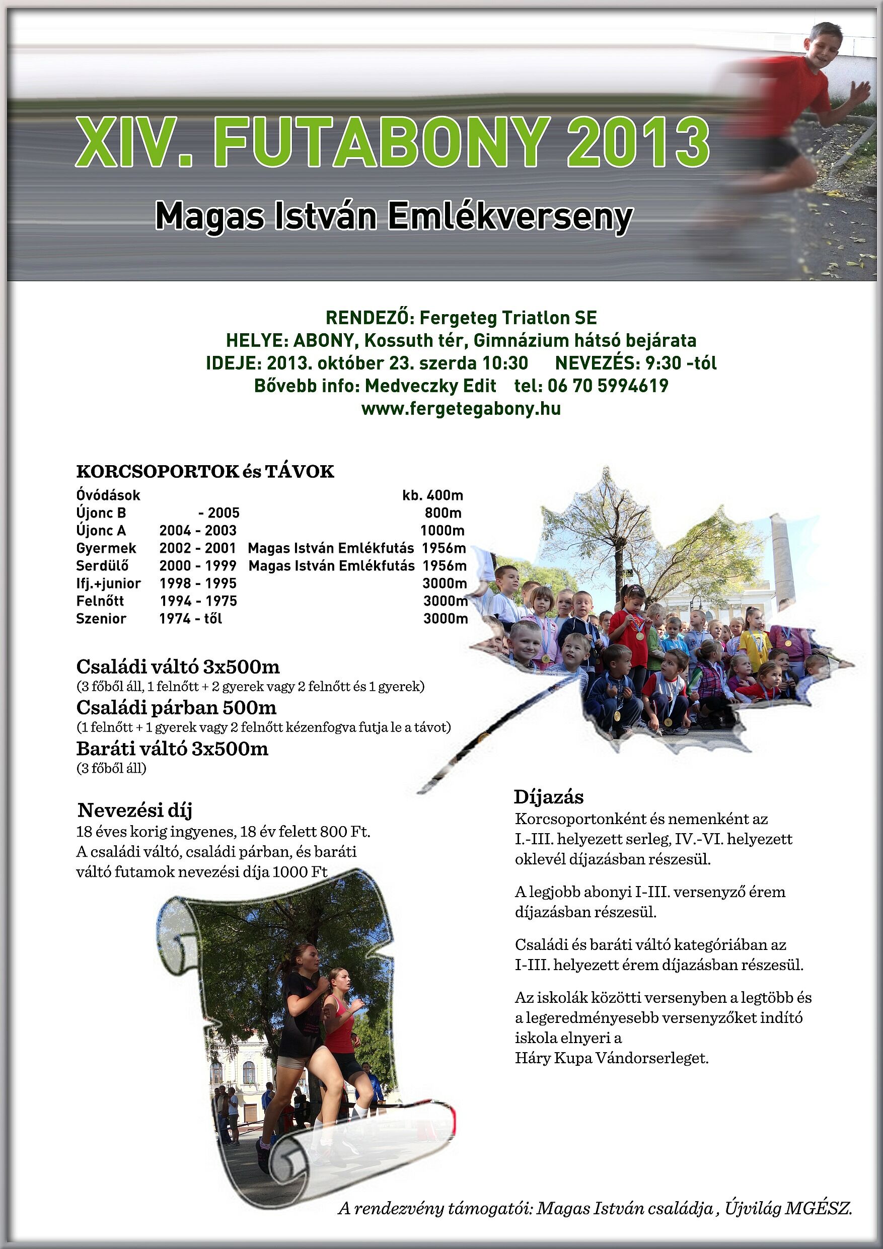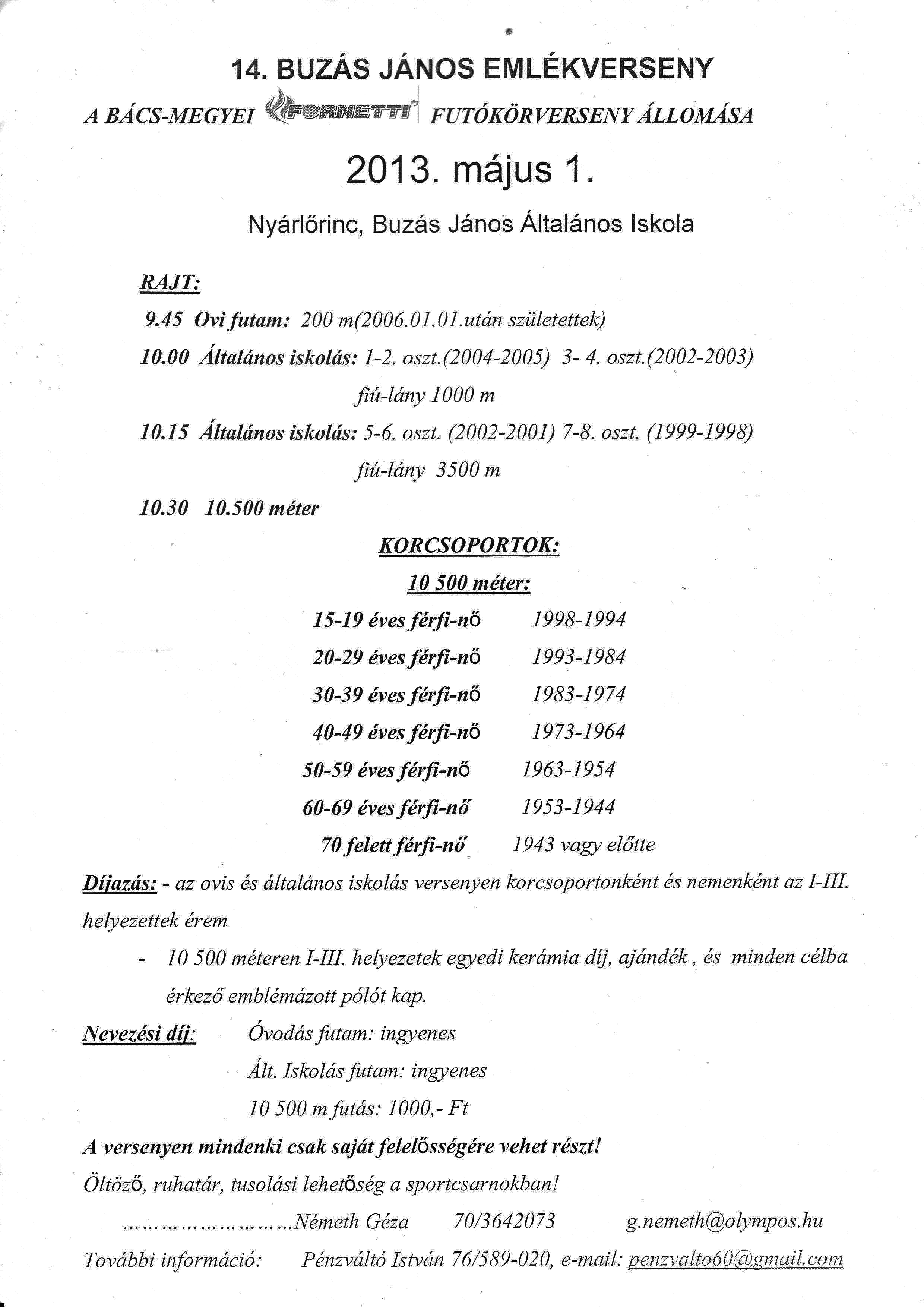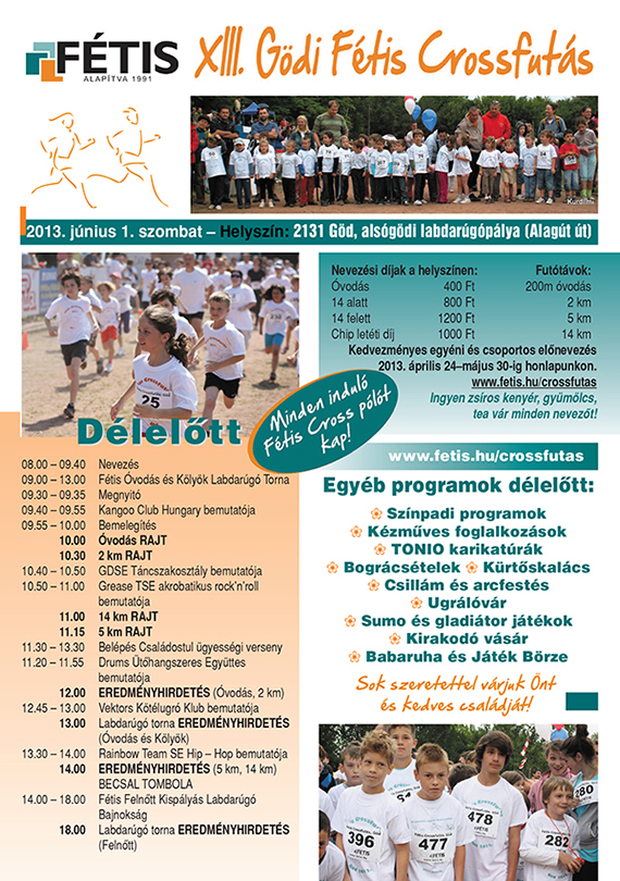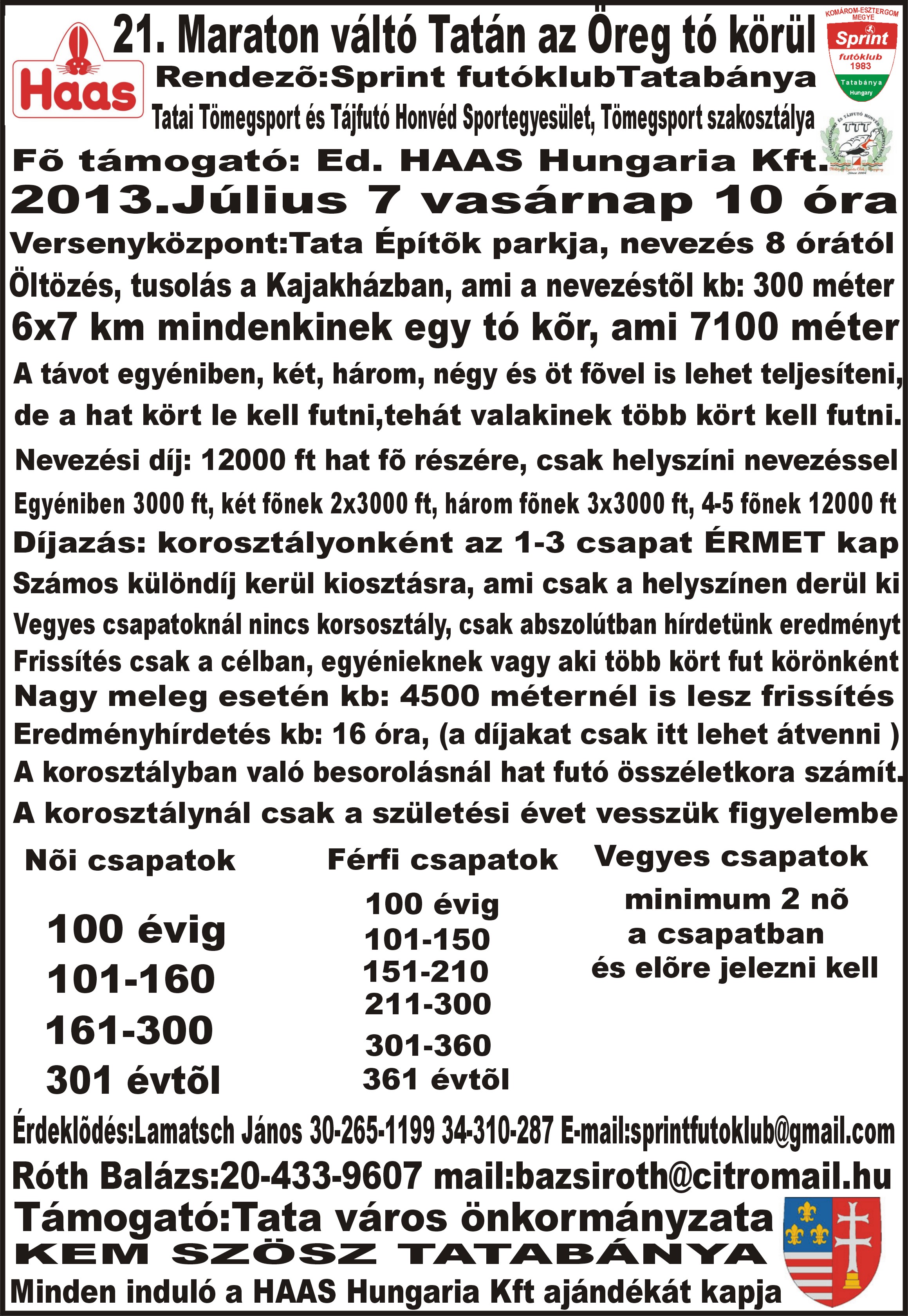 Január 01.hét Jan.01.ked. Új Évi Futás - Debrecen - Nagyerdő 5,5km. kiírás nem mért Jan.05.szo. Oxigén Kupa - terepfutóverseny - Debrecen - R: Oxigen (korosztályos) 1,5-2,5-5-10km. kiírás eredmények Jan.05.szo. Szigetfutás - Budapest - Margitsziget 5km. kiírás eredmények Jan.06.vas. Gútai vízkereszt maraton (3.) és félmaraton - Szlovákia 21-42k. kiírás eredmények 02.hét Jan.12.szo. Mura Kupa futóversenyt (2.) - Murakeresztúr 6-12-21km. kiírás eredmények Jan.13.vas. Szentendre crossfutás - R: Futapest 4-12km. kiírás eredmények Jan.13.vas. Várkúti hegyifutó versenysorozat (20.) - 2. forduló - R: Egri Spartacus SE 4-8-16km. kiírás eredmények 03.hét 04.hét Jan.27.vas. Etyek cross - R: Futapest 5-13km. kiírás eredmények Jan.27.vas. Siracusa City maraton (14.)- országúti futóverseny - Italia 10-21-42km. kiírás eredmények Február 05.hét Feb.02.szo. Szigetfutás - Budapest - Margitsziget 5km. kiírás eredmények Feb.02.szo. Domb futás - Kecskemét - R: Iustitia SE 0,8-3,5-7km. kiírás eredmények Feb.02.szo. Erdei Futóverseny - Szombathely - R: Göcsej KTFE 3-10km. kiírás eredmények Feb.03.vas. Kaposvár Dombjai Félmaraton (3.) - egyéni és váltófutás (korosztályos) 21km. kiírás eredmények 06.hét Feb.09.szo. Margita Terep Maraton (7.)- Gödöllő - R: Margita 344,2 21-44km. kiírás eredmények Feb.10.vas. Csikóváralja cross - terepfutóverseny - Pomáz - R: Futapest 6-12km. kiírás eredmények Feb.10.vas. Várkúti hegyifutó versenysorozat (20.) - 3. forduló - R: Egri Spartacus SE 4-8-16km. kiírás eredmények 07.hét Feb.16.szo. Oxigén Kupa - terepfutóverseny - Debrecen - R: Oxigen (korosztályos) 1,5-2,5-5-10km. kiírás eredmények 08.hét Feb.23.szo. Négy évszak maraton - Pusztaszabolcs - R: PSZE 10km. kiírás eredmények Feb.23.szo. Latyakfutás (9.) - Bogács - R: TTF SE 14km. kiírás eredmények Feb.24.vas. Tövis cross - terepfutóverseny (9.) - Domonyvölgy - R: Futapest 4-13km. kiírás eredmények Feb.24.vas. Erdei Futóverseny - Szombathely - R: Göcsej KTFE 3-10km. kiírás eredmények Feb.24.vas. Sevilla maraton (29.) - utcai futóverseny - Spain (pénzdíjas) 42km. kiírás eredmények Március 09.hét Már.02.szo. Oxigén Kupa - terepfutóverseny - Debrecen - R: Oxigen (korosztályos) 1,5-2,5-5-10km. kiírás eredmények Már.02.szo. Szigetfutás - Budapest - Margitsziget 5km. kiírás eredmények Már.02.szo. Tron Születésnapi Félmaraton (6.) - Palics 5-21km. kiírás eredmények Már.03.vas. Bükki kilátások (12.) terepfutás - Felsőtárkány - R: Egri Spartacus SE 44-66km. kiírás eredmények Már.03.vas. Pécs - Harkány - országúti futóverseny (29.) - R: PVSK (korosztályos, pénzdíjas)) 25km. kiírás eredmények Már.03.vas. Göcseji Galopp - Kávás - R: Göcsej KTFE 16-55km. kiírás eredmények Már.03.vas. Treviso maraton (10.) - utcai futóverseny - Italia 42km. kiírás eredmények 10. héi Már.09.szo. Tavaszváró Terepfutóverseny a Naplás Tónál - Budapest - R: MAHFuSZ 1-2-11km. kiírás eredmények Már.09.szo. OptiVita Ultrafutó Kupa - Székesfehérvár R: IronTeam 1-2-4-6-12ó. kiírás eredmények Már 09.szo. Péti Schmidt Ferenc Terepfutóverseny (43.) - Pétfürdő 0,5-3-5-10km. kiírás eredmények Már.10.vas. Duna menti Zöldsport Fesztivál - Vác - R: Zöldgömb (korosztályos) 2-5-10-21-30-42km. kiírás eredmények 11.hét Már.16.szo. Vácrátót cross sík, homokos terepen (14.) - R: Futapest 4-12km. kiírás eredmények Már.16.szo. PILIS VERTIKAL (8.) - Pilisszántó - R: MVTE - facebook ~ HEGYIFUTAS.HU 6,5km. kiírás eredmények Már.16.szo. Pilis-vörös-vár Terepfutó verseny 38km. kiírás eredmények Már.16.szo. Auriga Erdei Futóverseny - Szolnok 0,2-1,6-3-5,5-11km. kiírás eredmények Már.17.vas. Dunaparti Futópartik - 1. forduló - aszfaltos töltésen - Esztergom 0,5-4-10km. kiírás eredmények Már.17.vas. Eged-hegyi Terepfutás 6-13,4km. kiírás eredmények Már.17.vas. Roma maraton (19.) - utcai futóverseny - Italia 42km. kiírás eredmények Már.17.vas. Barcelona maraton (13.) - utcai futóverseny - Spain 42km. kiírás eredmények 12.hét Már.21-24. Balaton szupermaraton - R: BSI 195km. kiírás eredmények Már.22.pén. TTA Mezei Futóajnokság (7.) - Tápiószecső - R: TTA 1-2-3km. kiírás eredmények Már.23.szo. Vásárhelyi Családi Futófesztivál (19.) utcákon - Kecskemét (koroszt.) 0,6-1-3-5-10-21km. kiírás eredmények Már.23.szo. Gazdagréti Tavaszindító Futóverseny - R: Gyaloggalopp 0,5-1-2,5-5-10km. kiírás eredmények Már.24.vas. Rotary Debrecen félmaraton - maraton (3.) -utcákon - Debrecen 10,5-21-42km. kiírás eredmények Már.24.vas. Ferrara maraton - félmaraton - utcai futóverseny - Italia 21-42km. kiírás eredmények Már.24.vas. Novi Sad félmaraton (20.) - Szerbia 10-21km. kiírás eredmények 13.hét Már.30.szo. Rákoscsabai Terepfutás - R: Koren Tamás 4-12-21km. kiírás eredmények Már.30.szo. Sárvár-fürdő félmaraton (14.) - R: Sárvári Kinizsi SE 21km. kiírás eredmények Már.30.szo. Bonyhád - Bátaszék - szintes országúti - Félmaraton (korosztályos) 24km. kiírás eredmények Már.31.vas. Tatai Téli Tamkodrom crossfutás (10.) - Tata, Bakodi tó - R: TTT-HSE 1-4-5,1km. kiírás elmaradt!! Április 14.hét Ápr.06.szo. Pólus Futónap - Budapest Nyílt Mezei Futóbajnokság - Pólus Center 1,4-3-4-6-8km. kiírás eredmények Ápr.06.szo. Szigetfutás - Budapest - Margitsziget 5km. kiírás eredmények Ápr.06.szo. Herceghalmi Terepfutás - R: Gyaloggalopp 0,5-1-5-14km. kiírás eredmények Ápr.06.szo. Győrújbarát crossfutás (18.) - R: GyMS Megyei Szövetség 1-4-7-14km. kiírás eredmények Ápr.06.szo. Domb futás - Kecskemét - R: Iustitia SE 0,8-3,5-7km. kiírás eredmények Ápr.06.szo. Kisbéri 100 és 50km-es futóverseny - R: Unix SE 50-100km. kiírás eredmények Ápr.06.szo. Mérőmaraton Futóverseny (1.) - Kaposmérő 7-21km. kiírás eredmények 