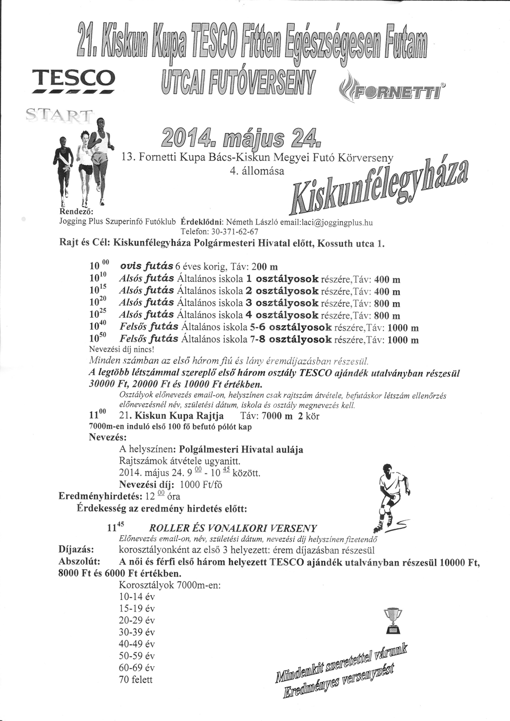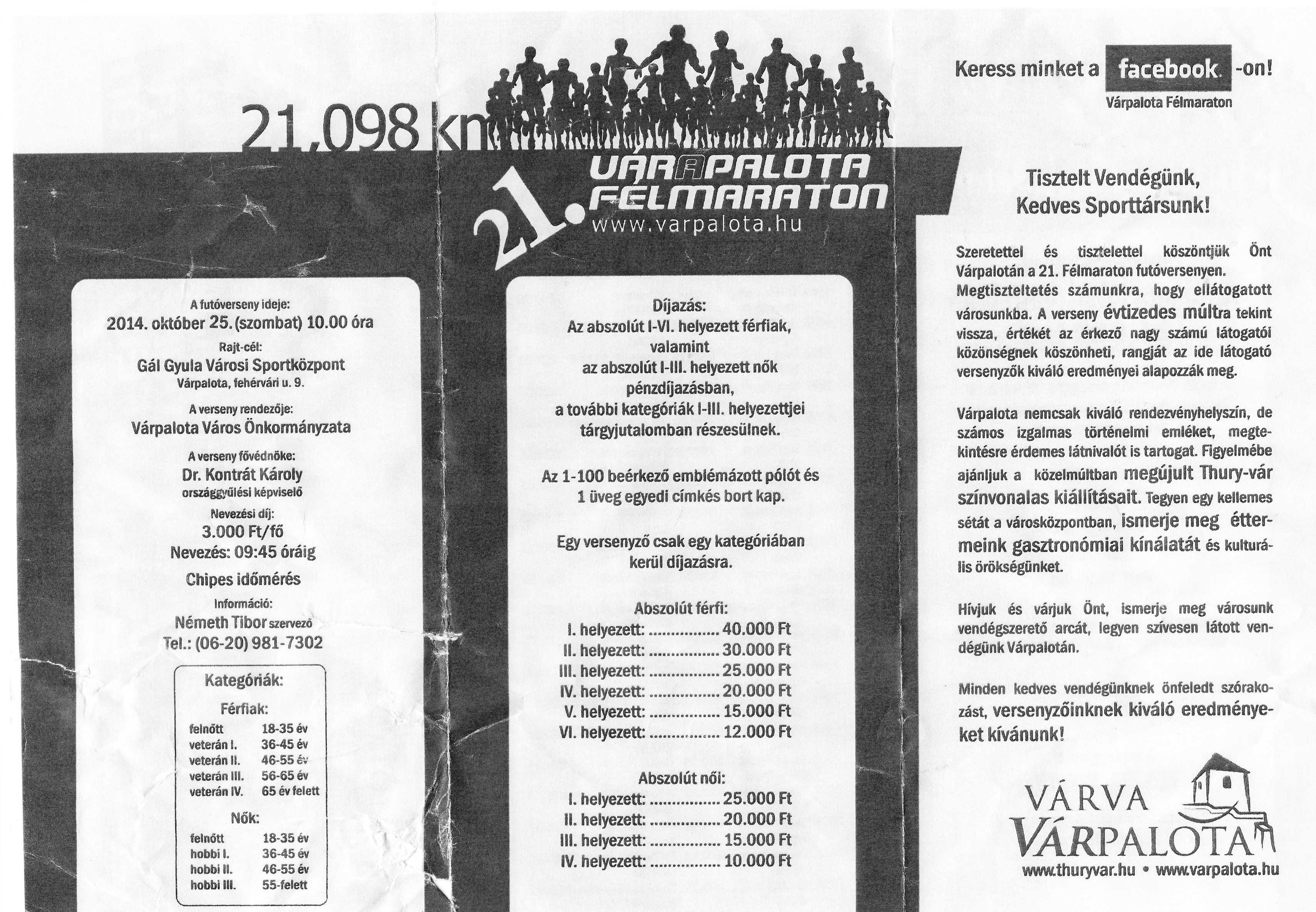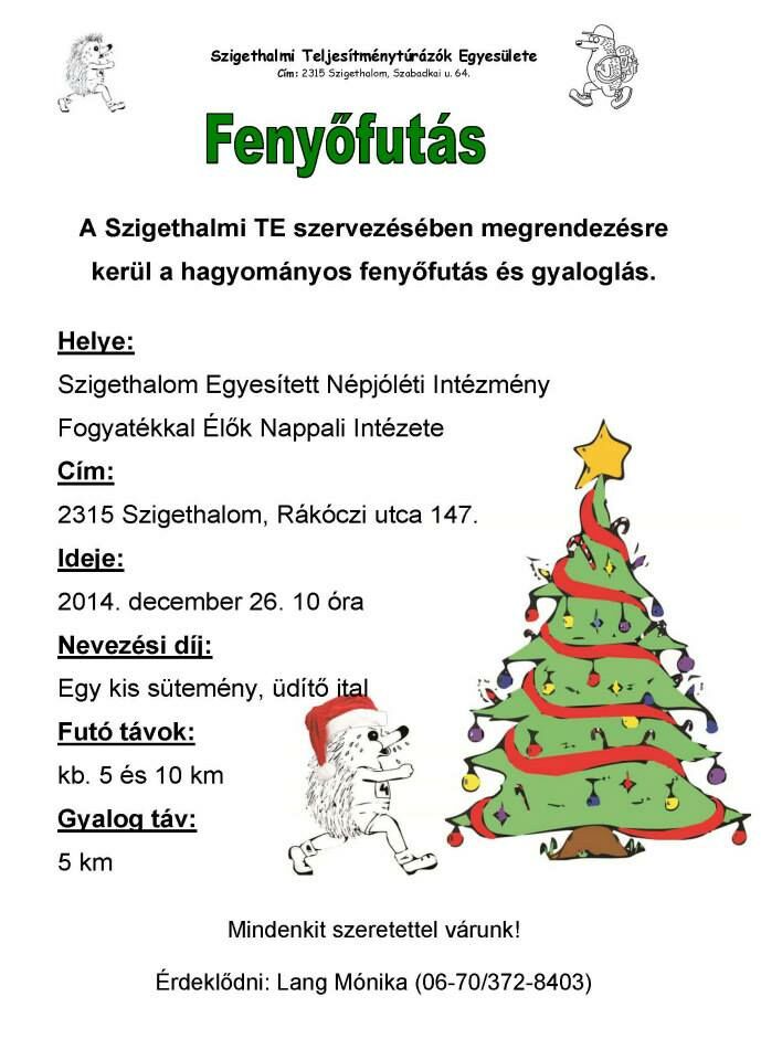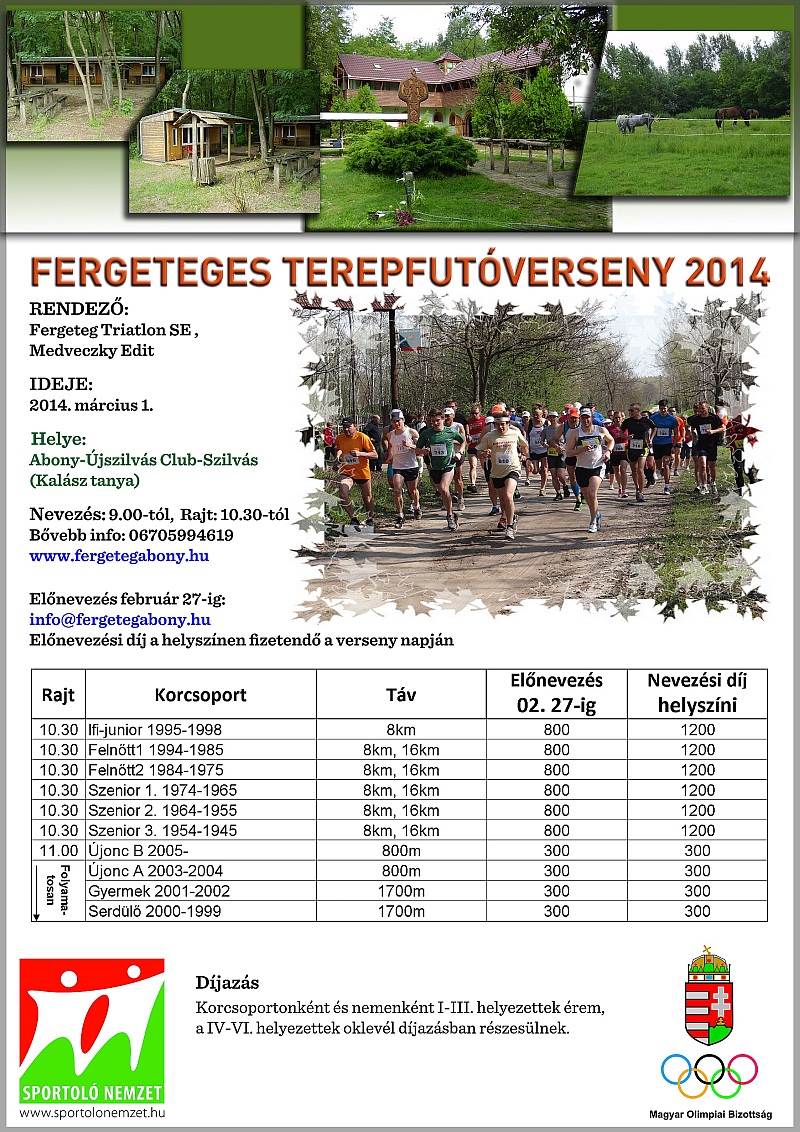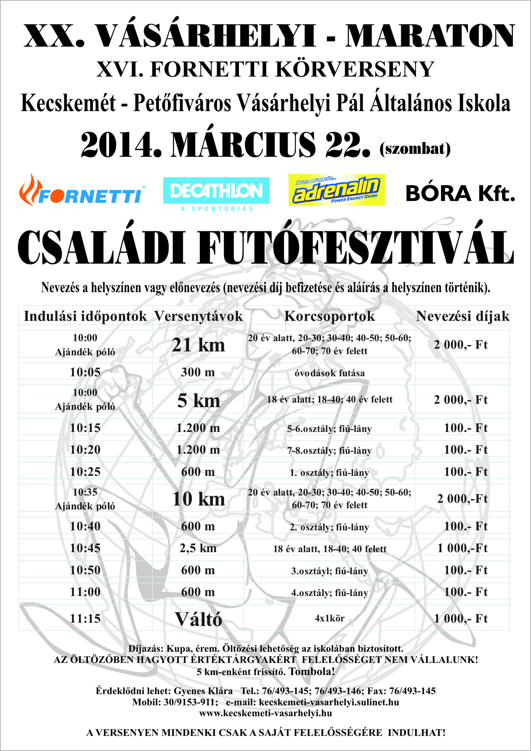 Január 01. hét Jan.01.sze. Újévi Futás (3.)- 12.00 óra - Debrecen - R: DKM SE 6km. kiírás nem listás Jan.01.sze. Szufla Újévi Futás - R: Szufla 6km. kiírás nem listás Jan.04.szo. Szigetfutás - Budapest - Margitsziget 5,3km. kiírás eredmények Jan.05.vas. Gútai vízkereszt maraton (4.) és félmaraton - Szlovákia 21-42k. kiírás eredmények 02. hét Jan.06.hét. Háromkirályok Futóverseny - Kassa - Szlovákia 5km. kiírás eredmények Jan.11.szo. Oxigén Kupa - terepfutóverseny - Debrecen - R: Oxigen (korosztályos) 1,5-2,5-5-10km. kiírás eredmények Jan.11.szo. Mura Kupa futóversenyt (3.) - Murakeresztúr 6-12-21km. kiírás eredmények Jan.12.vas. Várkúti hegyifutó versenysorozat (21.) - 2. forduló - R: Egri Spartacus SE 4-8-16km. kiírás eredmények Jan.12.vas. Szentendre crossfutás - R: Futapest 4-12km. kiírás eredmények 03. hét Jan.18.szo. Etyek-New York Félmaraton 22km. kiírás nem listás 04. hét Jan.26.vas. Etyek cross - R: Futapest 5-13km. kiírás eredmények Jan.26.vas. Siracusa City maraton (15.)- országúti futóverseny - Italia 10-21-42km. kiírás eredmények Február 05. hét Feb.01.szo. Szigetfutás - Budapest - Margitsziget 5,3km. kiírás eredmények Feb.01.szo. Budapest Fedettpályás Atlétikai Bajnoksága 0,06÷3km. kiírás eredmények 06. hét Feb.08.szo. Margita Téli Maraton (8.)- Gödöllő - R: Margita 344,2 6-12-20-40km. kiírás eredmények Feb.08.szo. Domb futás - Kecskemét - R: KÖD SZSC 0,8-3,5-7km. kiírás eredmények Feb.09.vas. Csikóváralja cross - terepfutóverseny - Pomáz - R: Futapest 6-12km. kiírás eredmények Feb.09.vas. Kaposvár Dombjai Félmaraton (4.) - egyéni és váltófutás (korosztályos) 21km. kiírás eredmények 07. hét Feb.15.szo. Négy évszak maraton - Pusztaszabolcs - R: PSZE 10km. kiírás eredmények Feb.15.szo. Oxigén Kupa - terepfutóverseny - Debrecen - R: Oxigen (korosztályos) 1,5-2,5-5-10km. kiírás eredmények Feb.16.vas. Várkúti hegyifutó versenysorozat (21.) - 3. forduló - R: Egri Spartacus SE 4-8-16km. kiírás eredmények Feb.16.vas. Tündér-hegyi terepfutó verseny (1.) - Pétfürdő - R: VBTSE 16km. kiírás eredmények 08. hét Feb.22.szo. Latyakfutás (10.) - Bogács - R: TTF SE 14km. kiírás eredmények Feb.22.szo. Lajvér Avantgarde Forralt - Borvidék Terepmaraton - Szálka 10km. kiírás eredmények Feb.22.-23. Fedettpályás Országos Bajnokság - Budapest SYMA 0,06÷3km. kiírás eredmények Feb.23.vas. Pilisszentkereszt - terepfutóverseny - R: Futapest 4-13km. kiírás eredmények Feb.23.vas. Becsület futás - Kecskemét - R: Iustitia SE x2,5km. kiírás nem listás Feb.23.vas. Sevilla maraton (30.) - utcai futóverseny - Spain (pénzdíjas) 42km. kiírás eredmények 09. hét Feb.28.pén. Tel-Aviv maraton - Israel 42km. kiírás eredmények Március Már.01.szo. Szigetfutás - Budapest - Margitsziget 5,3km. kiírás eredmények Már.01.szo. Fergeteges Terepfutóverseny 2014 - Abony - R: Fergeteg Triatlon SE, 0,8-1,7-8-16km. kiírás eredmények Már.31.vas. Tatai Téli Tamkodrom crossfutás (11.) - Tata, Bakodi tó - R: TTT-HSE 1,5-4-6km. kiírás eredmények Már.01.szo. TRON születésnapi félmaraton (7.) és SRCEF örömfutás - Palics - Szerbia 5-21km. kiírás eredmények Már.02.vas. Bükki kilátások (13.) terepfutás - Felsőtárkány - R: Egri Spartacus SE 44-66km. kiírás eredmények Már.02.vas. Treviso maraton - Itália 42km. kiírás eredmények 10. hét Már.06.pén. eredmények 10. hét Már.06.pén. 5K futás - Budapest XX. ker 5km. kiírás eredmények Már.08.szo. Soroksári Futás - Budapest 5km. kiírás eredmények Már.08.szo. Tavaszváró Terepfutóverseny a Naplás Tónál (4.)- Budapest - R: MAHFuSZ 0,3-1-2-10km. kiírás eredmények Már.08.szo. Oxigén Kupa - terepfutóverseny - Debrecen - R: Oxigen (korosztályos) 1,5-2,5-5-10km. kiírás eredmények Már 08.szo. Péti Schmidt Ferenc Terepfutóverseny (44.) - Pétfürdő 0,5-3-5-10km. kiírás eredmények Már.08.szo. OptiVita Ultrafutó Kupa - Székesfehérvár R: IronTeam 2-4-6-12ó. kiírás eredmények Már.09.vas. Pécs - Harkány - országúti futóverseny (30.) - R: PVSK (korosztályos, pénzdíjas)) 25km. kiírás eredmények Már.09.vas. Duna menti Zöldsport Fesztivál - Vác - R: Zöldgömb (korosztályos) 2-5-10-21-30-42km. kiírás eredmények Már.09.vas. Cyprus maraton - félmaraton 10-21-42km. kiírás eredmények 11. hét Már.15.szo. SZAMOSZ Fedettpályás Orsz.Bajn. - Budapest SYMA 0,06÷1,5km. kiírás eredmények Már.15.szo. OVER Pilis Vertikál - Pilisszántó - R: MVTE 6,5km. kiírás eredmények Már.15.szo. Imre - Lőrinc Futóverseny (9. - Budapest 0,3-0,7-2-3km. kiírás eredmények Már.15.szo. Napfordí-Tó-Futás (6.) - Sikonda - R: DÖKE 0,8-1,3-2,7km. kiírás eredmények Már.16.vas. Pilis-vörös-vár Terepfutó verseny - Pilisvörösvár - R: MVTE 39km. kiírás eredmények Már.16.vas. Vácrátót cross sík, homokos terepen (15.) - R: Futapest 4-12km. kiírás eredmények Már.16.vas. Auriga Erdei Futóverseny - Szolnok 0,2-1,6-3-5,5-11km. kiírás eredmények Már.16.vas. Barcelona maraton (14.) - utcai futóverseny - Spain 42km. kiírás eredmények Már.16.vas. Riviera Classic (4.) - országúti szintes futóverseny - France 10-24km. kiírás eredmények Már.16.vas. Ferrara maraton (41.) - félmaraton - utcai futóverseny - Italia 21-42km. kiírás eredmények Már.16.vas. Limasol maraton - Cyprus 10-21-42km. kiírás eredmények 12. hét Már.20-23. SPURI Balaton szupermaraton (7.) - R: BSI 195km. kiírás eredmények Már.20.csü. TTA Mezei Futóajnokság (8.) - Tápiószecső - R: TTA 1-2-3km. kiírás eredmények Már.21.pén. SPURI Öböl Félmaraton 2014 - Keszthely - R: BSI 21km. kiírás eredmények Már.22.szo. Vásárhelyi Családi Futófesztivál (20.) utcákon - Kecskemét (koroszt.) 0,6-1-3-5-10-21km. kiírás eredmények Már.22.szo. Budai Terepfutás - Budapest XIIker. - R: Bp Atl. Szöv. 5-10km. kiírás eredm