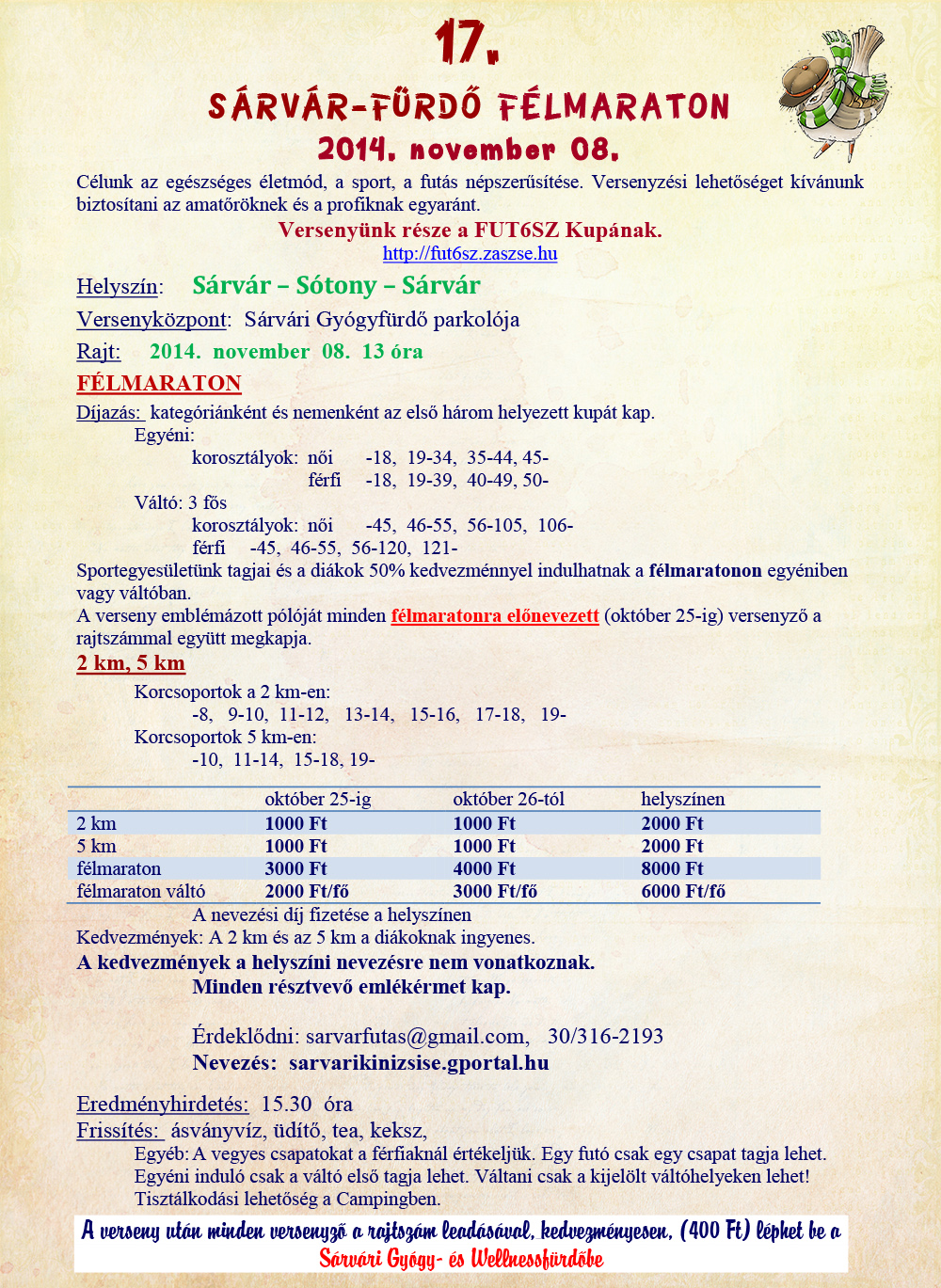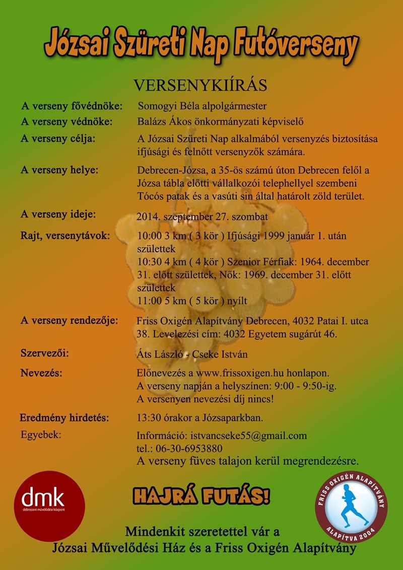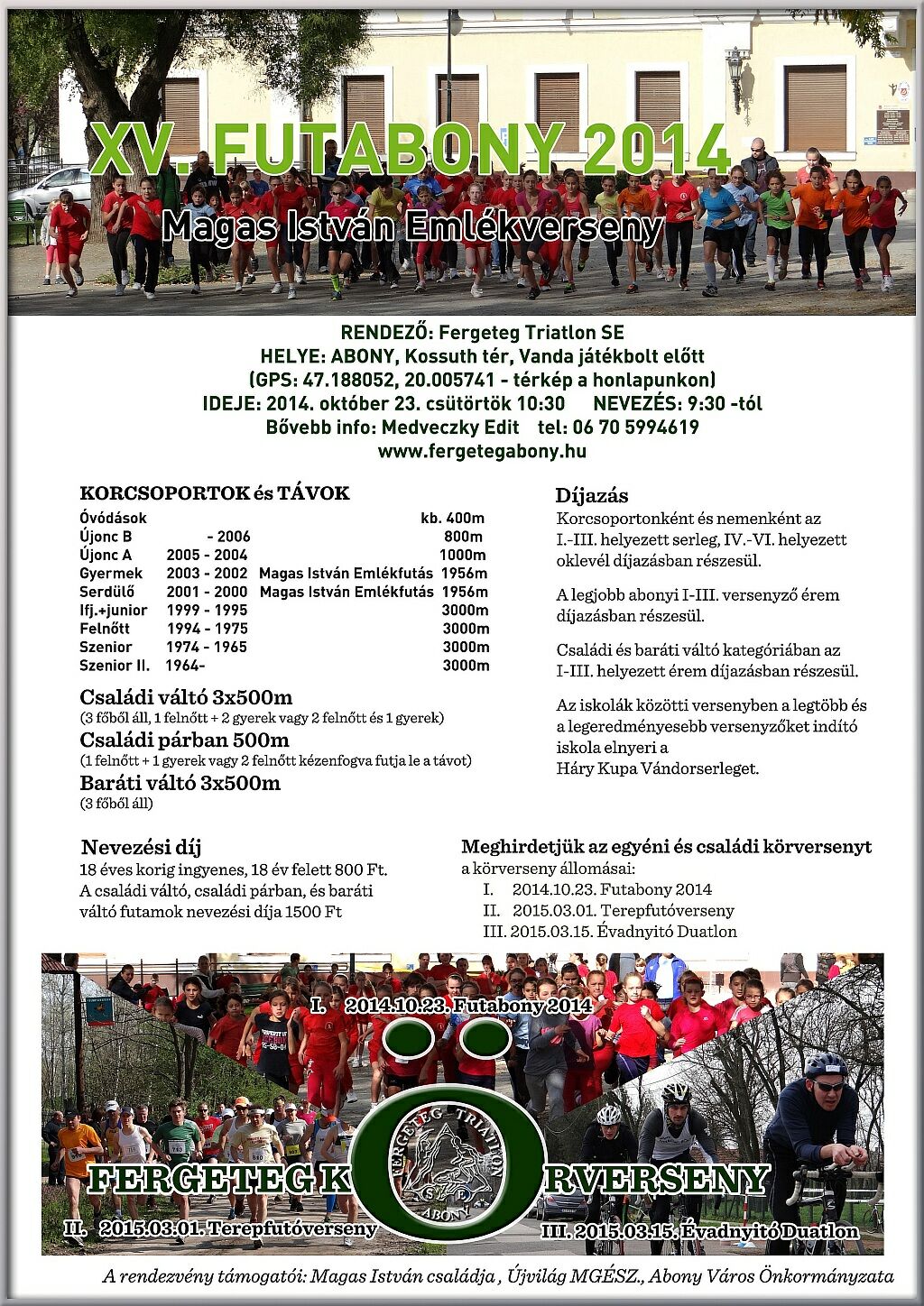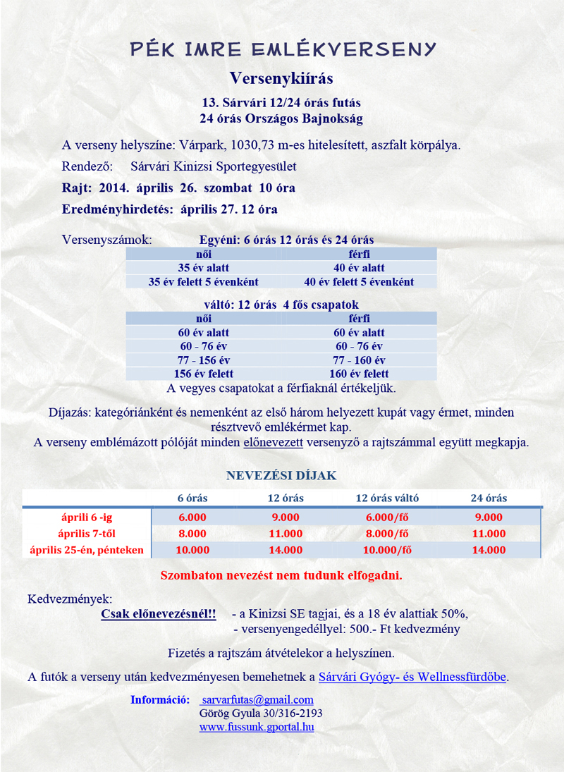 Január 01. hét Jan.01.sze. Újévi Futás (3.)- 12.00 óra - Debrecen - R: DKM SE 6km. kiírás nem listás Jan.01.sze. Szufla Újévi Futás - R: Szufla 6km. kiírás nem listás Jan.04.szo. Szigetfutás - Budapest - Margitsziget 5,3km. kiírás eredmények Jan.05.vas. Gútai vízkereszt maraton (4.) és félmaraton - Szlovákia 21-42k. kiírás eredmények 02. hét Jan.06.hét. Háromkirályok Futóverseny - Kassa - Szlovákia 5km. kiírás eredmények Jan.11.szo. Oxigén Kupa - terepfutóverseny - Debrecen - R: Oxigen (korosztályos) 1,5-2,5-5-10km. kiírás eredmények Jan.11.szo. Mura Kupa futóversenyt (3.) - Murakeresztúr 6-12-21km. kiírás eredmények Jan.12.vas. Várkúti hegyifutó versenysorozat (21.) - 2. forduló - R: Egri Spartacus SE 4-8-16km. kiírás eredmények Jan.12.vas. Szentendre crossfutás - R: Futapest 4-12km. kiírás eredmények 03. hét Jan.18.szo. Etyek-New York Félmaraton 22km. kiírás nem listás 04. hét Jan.26.vas. Etyek cross - R: Futapest 5-13km. kiírás eredmények Jan.26.vas. Siracusa City maraton (15.)- országúti futóverseny - Italia 10-21-42km. kiírás eredmények Február 05. hét Feb.01.szo. Szigetfutás - Budapest - Margitsziget 5,3km. kiírás eredmények Feb.01.szo. Budapest Fedettpályás Atlétikai Bajnoksága 0,06÷3km. kiírás eredmények 06. hét Feb.08.szo. Margita Téli Maraton (8.)- Gödöllő - R: Margita 344,2 6-12-20-40km. kiírás eredmények Feb.08.szo. Domb futás - Kecskemét - R: KÖD SZSC 0,8-3,5-7km. kiírás eredmények Feb.09.vas. Csikóváralja cross - terepfutóverseny - Pomáz - R: Futapest 6-12km. kiírás eredmények Feb.09.vas. Kaposvár Dombjai Félmaraton (4.) - egyéni és váltófutás (korosztályos) 21km. kiírás eredmények 07. hét Feb.15.szo. Négy évszak maraton - Pusztaszabolcs - R: PSZE 10km. kiírás eredmények Feb.15.szo. Oxigén Kupa - terepfutóverseny - Debrecen - R: Oxigen (korosztályos) 1,5-2,5-5-10km. kiírás eredmények Feb.16.vas. Várkúti hegyifutó versenysorozat (21.) - 3. forduló - R: Egri Spartacus SE 4-8-16km. kiírás eredmények Feb.16.vas. Tündér-hegyi terepfutó verseny (1.) - Pétfürdő - R: VBTSE 16km. kiírás eredmények 08. hét Feb.22.szo. Latyakfutás (10.) - Bogács - R: TTF SE 14km. kiírás eredmények Feb.22.szo. Lajvér Avantgarde Forralt - Borvidék Terepmaraton - Szálka 10km. kiírás eredmények Feb.22.-23. Fedettpályás Országos Bajnokság - Budapest SYMA 0,06÷3km. kiírás eredmények Feb.23.vas. Pilisszentkereszt - terepfutóverseny - R: Futapest 4-13km. kiírás eredmények Feb.23.vas. Becsület futás - Kecskemét - R: Iustitia SE x2,5km. kiírás nem listás Feb.23.vas. Sevilla maraton (30.) - utcai futóverseny - Spain (pénzdíjas) 42km. kiírás eredmények 09. hét Feb.28.pén. Tel-Aviv maraton - Israel 42km. kiírás eredmények Március Már.01.szo. Szigetfutás - Budapest - Margitsziget 5,3km. kiírás eredmények Már.01.szo. Fergeteges Terepfutóverseny 2014 - Abony - R: Fergeteg Triatlon SE, 0,8-1,7-8-16km. kiírás eredmények Már.31.vas. Tatai Téli Tamkodrom crossfutás (11.) - Tata, Bakodi tó - R: TTT-HSE 1,5-4-6km. kiírás eredmények Már.01.szo. TRON születésnapi félmaraton (7.) és SRCEF örömfutás - Palics - Szerbia 5-21km. kiírás eredmények Már.02.vas. Bükki kilátások (13.) terepfutás - Felsőtárkány - R: Egri Spartacus SE 44-66km. kiírás eredmények Már.02.vas. Treviso maraton - Itália 42km. kiírás eredmények 10. hét Már.06.pén. eredmények 10. hét Már.06.pén. 5K futás - Budapest XX. ker 5km. kiírás eredmények Már.08.szo. Soroksári Futás - Budapest 5km. kiírás eredmények Már.08.szo. Tavaszváró Terepfutóverseny a Naplás Tónál (4.)- Budapest - R: MAHFuSZ 0,3-1-2-10km. kiírás eredmények Már.08.szo. Oxigén Kupa - terepfutóverseny - Debrecen - R: Oxigen (korosztályos) 1,5-2,5-5-10km. kiírás eredmények Már 08.szo. Péti Schmidt Ferenc Terepfutóverseny (44.) - Pétfürdő 0,5-3-5-10km. kiírás eredmények Már.08.szo. OptiVita Ultrafutó Kupa - Székesfehérvár R: IronTeam 2-4-6-12ó. kiírás eredmények Már.09.vas. Pécs - Harkány - országúti futóverseny (30.) - R: PVSK (korosztályos, pénzdíjas)) 25km. kiírás eredmények Már.09.vas. Duna menti Zöldsport Fesztivál - Vác - R: Zöldgömb (korosztályos) 2-5-10-21-30-42km. kiírás eredmények Már.09.vas. Cyprus maraton - félmaraton 10-21-42km. kiírás eredmények 11. hét Már.15.szo. SZAMOSZ Fedettpályás Orsz.Bajn. - Budapest SYMA 0,06÷1,5km. kiírás eredmények Már.15.szo. OVER Pilis Vertikál - Pilisszántó - R: MVTE 6,5km. kiírás eredmények Már.15.szo. Imre - Lőrinc Futóverseny (9. - Budapest 0,3-0,7-2-3km. kiírás eredmények Már.15.szo. Napfordí-Tó-Futás (6.) - Sikonda - R: DÖKE 0,8-1,3-2,7km. kiírás eredmények Már.16.vas. Pilis-vörös-vár Terepfutó verseny - Pilisvörösvár - R: MVTE 39km. kiírás eredmények Már.16.vas. Vácrátót cross sík, homokos terepen (15.) - R: Futapest 4-12km. kiírás eredmények Már.16.vas. Auriga Erdei Futóverseny - Szolnok 0,2-1,6-3-5,5-11km. kiírás eredmények Már.16.vas. Barcelona maraton (14.) - utcai futóverseny - Spain 42km. kiírás eredmények Már.16.vas. Riviera Classic (4.) - országúti szintes futóverseny - France 10-24km. kiírás eredmények Már.16.vas. Ferrara maraton (41.) - félmaraton - utcai futóverseny - Italia 21-42km. kiírás eredmények Már.16.vas. Limasol maraton - Cyprus 10-21-42km. kiírás eredmények 12. hét Már.20-23. SPURI Balaton szupermaraton (7.) - R: BSI 195km. kiírás eredmények Már.20.csü. TTA Mezei Futóajnokság (8.) - Tápiószecső - R: TTA 1-2-3km. kiírás eredmények Már.21.pén. SPURI Öböl Félmaraton 2014 - Keszthely - R: BSI 21km. kiírás eredmények Már.22.szo. Vásárhelyi Családi Futófesztivál (20.) utcákon - Kecskemét (koroszt.) 0,6-1-3-5-10-21km. kiírás eredmények Már.22.szo. Budai Terepfutás - Budapest XIIker. - R: Bp Atl. Szöv. 5-10km. kiírás eredm