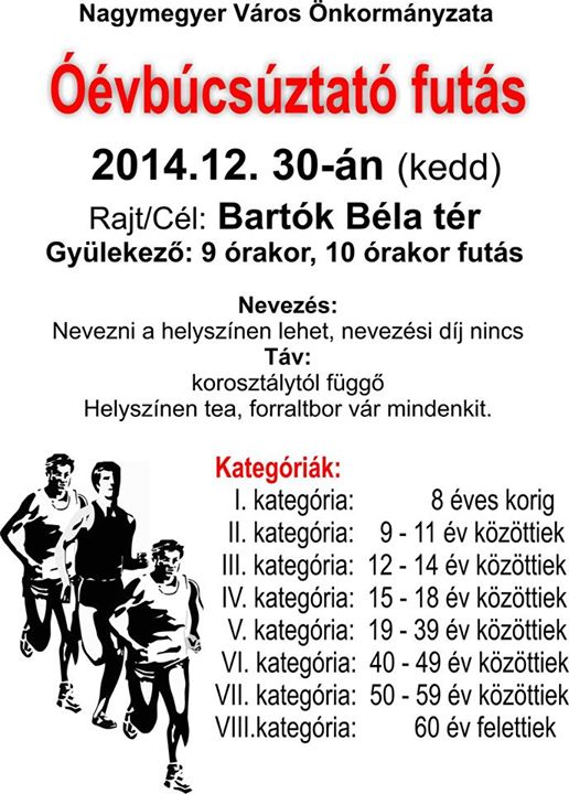 53. hét Dec.30.ked. Óévbúcsúztató Futás - Nagymegyer - Szlovákia - korosztályos 0,8÷4,2km. kiírás eredmények Dec.31.sze. Egerszegi Mountain Man Marathon - Zalaegerszeg (20.) 3,5-10-24-41km. kiírás eredmények Dec.31.sze. Pezsgőfutás (30.) - országúti futóverseny - Velence (korosztályos) 5-14km. kiírás eredmények Dec.31.sze. Szilveszteri Futóverseny - R: Melitta SE 3km. kiírás eredmények Dec.31.sze. Szilveszteri Jelmezes Futás - Esztergom 1,5-17km. kiírás nem mért Dec.31.sze. Szilvesteri Futás (34.) - Tata 7km. kiírás eredmények Dec.31.sze. BBU Szilveszteri Futás - Budapest - Merkapt Sporttelep Maglódi út - 10 óra 0,3-1,5-9km. kiírás eredmények Dec.31.sze. Törökbálinti Szilveszteri Hegyi Félmaraton 21km. kiírás eredmények