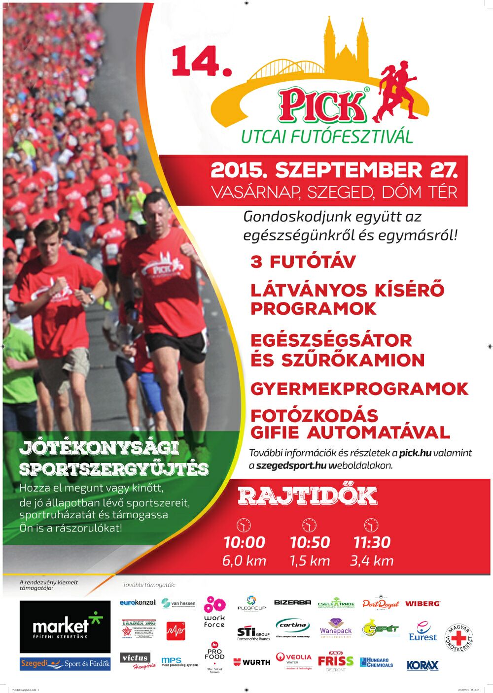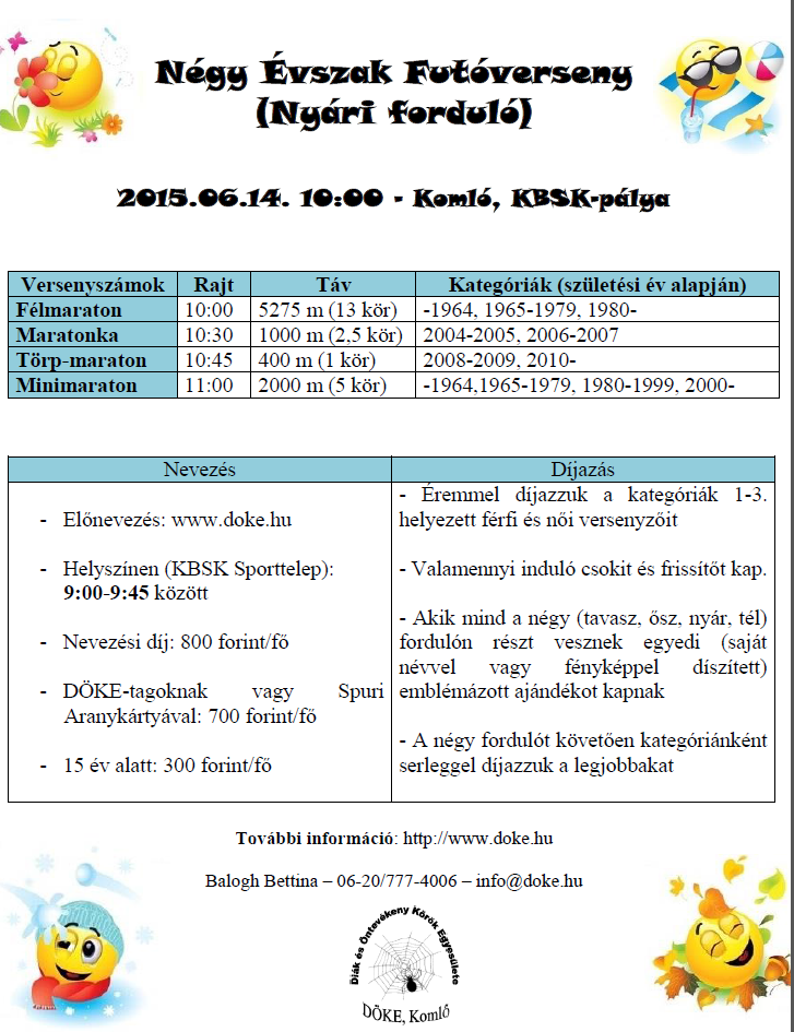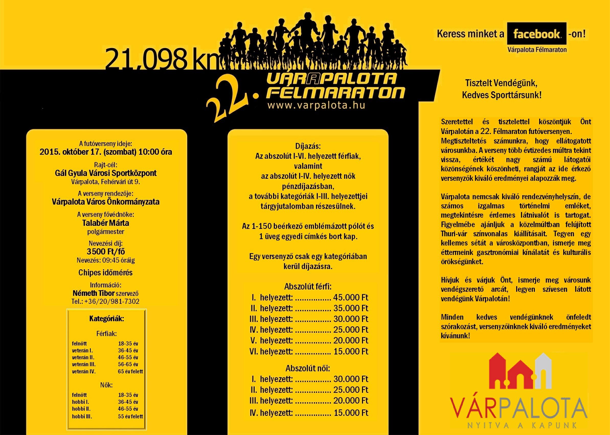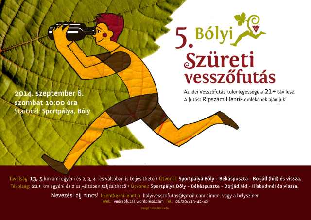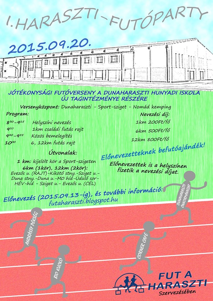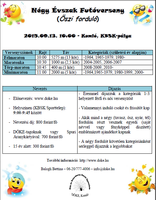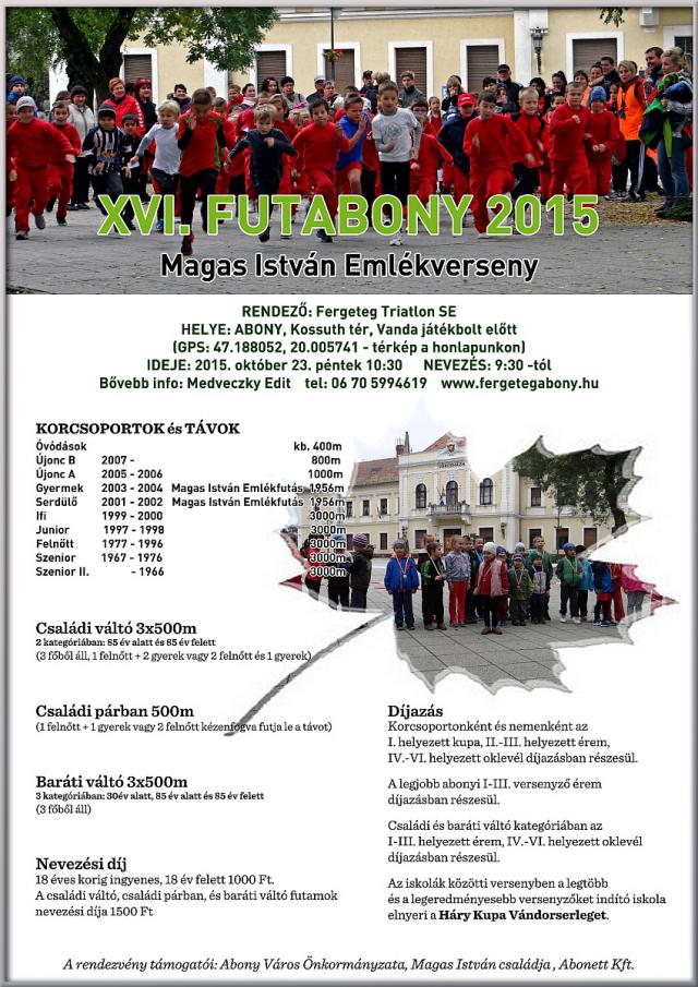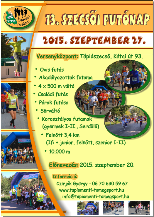 Szeptember 36. hét Sze.05.szo. Atomfutás (4.), BrutálATOM (3.) és 50km-es OB - Paks 3,5-7-14-21-34km. kiírás eredmények Sze.05.szo. Ászár-Kerékteleki-Bársonyos félmaraton (13.) - R: Sprint (korosztályos kupadíj) 5-21km. kiírás eredmények Sze.05.szo. Electrolux VIDOR Jótékonysági Félmaraton - Nyíregyháza 3-21km. kiírás eredmények Sze.05.szo. Előzd meg a Kisvasutat - Balatonfenyves - R: Zöldgömb 1-8-16km. kiírás eredmények Sze.05.szo. NN FAMILY RUN - egyéni és váltó futások - Budapest 3-5,2-10,5-21km. kiírás eredmények Sze.05.szo. Nomád Baradla Underground Trail (4.) 16-34km. kiírás eredmények Sze.05.szo. Szigetfutás - Budapest - Margitsziget 5,3km. kiírás eredmények Sze.05.szo. Szüreti Vesszőfutás (6.) - Bóly 13,5-21km. kiírás eredmények Sze.05.szo. Úri "Libaterelő" Teljesítménytúra és Terepfutó Kupa (7.) - Úri - R: TTA 9-14-27km. kiírás eredmények Sze.06.vas. Bodnár Bertalan Futó Maraton - Hódmezővásárhely 6,5-13-20km. kiírás eredmények Sze.06.vas. Ballószögi Nyakbavágó félmaraton (3.) 3,5-7-14-21km. kiírás eredmények Sze.06.vas. Életfa Terepfesztivál (9.) - Kamaraerdő - R: X2S Team, MAHFUSZ 0,5-1-6-10km. kiírás eredmények Sze.06.vas. Óbudai Futófesztivál 2.0. 3,5-7-21km. kiírás eredmények Sze.06.vas. SOMLÓCSÚCS - Futás (17.) - Somló (korosztályos kupa és éremdíjazás) 2,9-5,8km. kiírás eredmények Sze.06.vas. PrémiumKupa pénzdíjas utcai futóverseny - Budapest XVII. ker. 0,3-1,2-5,4-10km. kiírás eredmények Sze.06.vas. Tura terepfutás (4.) - R: Futapest (korosztályos éremdíjazás) 6-16km. kiírás eredmények 37. hét Sze.12.szo. Baglyashegyi Futóverseny (32.) - Várpalota - R: Marathon TKE 2-6-10km. kiírás eredmények Sze.12.szo. Futóverseny Zelenka István emlékére - Balassagyarmat (10.) 1-2-3-5-10km. kiírás eredmények Sze.12.szo. Négy komp közösségi futás - Szentendrei sziget 20,15km. kiírás nem mért Sze.12.szo. Savaria Legio Race - extrém futóverseny 0,7+-6+km. kiírás eredmények Sze.12.szo. Vadrózsa 50 - Rózsaszentmárton 50km. kiírás eredmények Sze.13.vas. Hajdufutás (17.) - utcai futóverseny - Hajdúböszörmény 0,2-0,8-1,6-2,4-6-8km. kiírás eredmények Sze.13.vas. Négy Évszak Futás őszi forduló - Komló - R: DÖKE 0,4-1-2-5,2km. kiírás eredmények Sze.13.vas. Szenior Félmaraton Bajnokság = Wizz Air Félmaraton - Budapest - R: BSI 21km. kiírás eredmények Sze.13.vas. Wizz Air Budapest Félmaraton (30.) - utcai verseny hidakkal - R: BSI (koroszt.) 21km. kiírás eredmények Sze.13.vas. Wachaumaraton (18.)- lejtős országúti futóverseny - Krems - Ausztria (korcs.)10-21-42km. kiírás eredmények 38. hét Sze.18.-20. I LOVE BALATON Szőlős Kör Ultrafutó Fesztivál 21-50-60-110km. kiírás eredmények Sze.19.szo. Barcs - Viroviticaa Határfutás (24.) 5,8-21km. kiírás elmaradt Sze.19.szo. Bonyhád - Bátaszék - szintes országúti - Félmaraton (korosztályos) 24km. kiírás eredmények Sze.19.szo. Csongrád - Szentes "G"-ÁT futás (19.) 6-14km. kiírás eredmények Sze.19.szo. DOROG SARPI Városfutás (1.) - Dorog 0,8-1,8-6-8km. kiírás eredmények Sze.19.szo. KESZI MARATON. Futóversenyek (5.) - Tiszakeszi 5-10-21-42km. kiírás eredmények Sze.19.szo. Marosmenti félmaraton (4.) - Makó 0,8-7,5-21km. kiírás eredmények Sze.19.szo. Nyírbátori Terep Maraton (1.) 5-10-21-42km. kiírás eredmények Sze.19.szo. Salomon Hervis Citytrail - Budapest - Gellért hegy 4,5-9km. kiírás eredmények Sze.19.szo. Soproni Cross Futás (6.) és MTB Verseny. (4.) 0,4-0,8-1,1-1,6-3,5-10km. kiírás eredmények Sze.19.szo. Greifenseelauf (35.) - Uster - Swiss 5-10-21km. kiírás eredmények Sze.20.vas. BBU Dobogókő Hegyi Fesztivál - országúti és terepfutás 6,5-16-27km. kiírás elmaradt Sze.20.vas. Haraszti Futóparti - Dunaharaszti 1-6-12km. kiírás eredmények Sze.20.vas. Két Híd Futás (3.) - Szécsény (korosztályos) 21km. kiírás eredmények Sze.20.vas. Zemplém félmaraton (1.) és Magashegyi Futóverseny (6.) - Sátoraljaújhely 3,8-10-21km. kiírás eredménye Sze.20.vas. Napfordulós világfutás - ősz kiírás nem mért Sze.20.vas. Tata tó futás - 1 és 2 tókör sétányon (fele erdőben) (korosztályos) 7-14km. kiírás eredmények Sze.20.vas. Újszászi Futónap (31.) 0,6-2-5-5-10km. kiírás eredmények Sze.20.vas. Vehír Futógála (4.) - Veszprém 6x0,4-2-7-21km. kiírás eredmények Sze.20.vas. Szarajevo félmaraton - Bosznia Hercegovina 4-21km. kiírás eredmények39. hét Sze.26.szo. 3Vulkán Kalandfutás (2.) - Mindszentkála 1,2-4-21km. kiírás eredmények Sze.26.szo. Jász Határ Futás - brutálfutás - Alattyán 7-11km. kiírás eredmények Sze.26.szo. Pákász Futam (2.) - Szeghalom 5,3-10,5-21km. kiírás eredmények Sze.26.szo. Dunaparti Futópartik - 4. forduló - aszfaltos töltésen - Esztergom 0,5-4-10km. kiírás eredmények Sze.26.szo. Mád-Tállya Futás 2015 7km. kiírás eredmények Sze.26.szo. Mozdulj, Soroksár - BUCI futó verseny (22.) 0,5-1,5-3-9km. kiírás eredmények Sze.27.vas. Balatoni Kék Maraton (2.) és Salföld 7 (1.) - terepfutó verseny - Balatonakali 7-42km. kiírás eredmények Sze.27.vas. DECATHLON Nagyerdei Maraton - Debrecen - R: DKM 5,2-10,5-21-42km. kiírás eredmények Sze.27.vas. Esztergom Félmaraton - R:Esztergomi Futóművek (korosztályos) 10-21km. kiírás eredmények Sze.27.vas. Hírös félmaraton - Kecskemét - R: Iustitia SE 7-14-21km. kiírás eredmények Sze.27.vas. II. Kerületi Kaptató - Budapest - Millenáris 1,3-1,8-2,2km. kiírás eredmények Sze.27.vas. Kis-Balaton kör - R: Zöldgömb elmaradt Sze.27.vas. Nagyerdei Terep Maraton - Debrecen - R: Szín-Kép Stúdió, Debreceni HSE 10-21-42km. kiírás eredmények Sze.27.vas. NATO Futás és Történelmi Váltófutás - Budapest 4-6,5-10km. kiírás eredmények Sze.27.vas. PICK Utcai Futófesztivál (14.) - Szeged 1,5-2,4-6km. kiírás eredmények Sze.27.vas. Sukori Terepfutás (1.) - Vilon