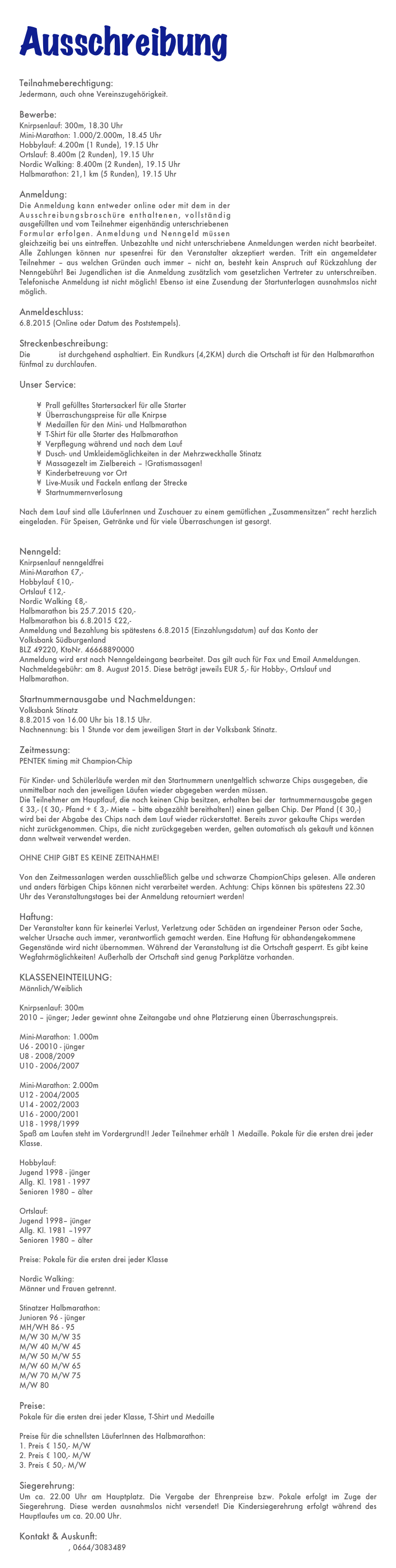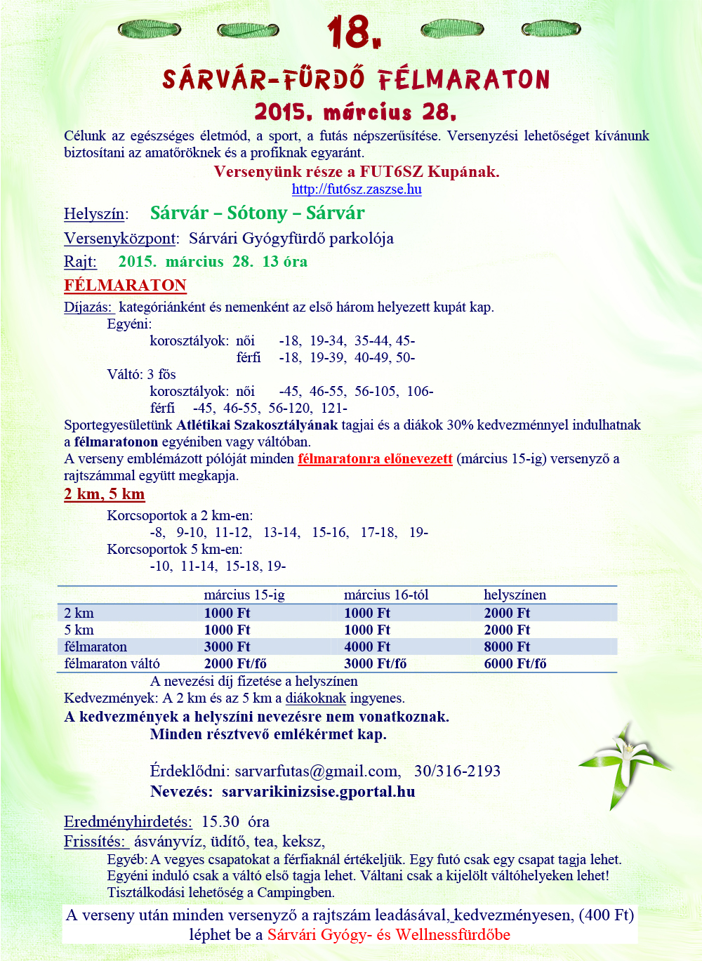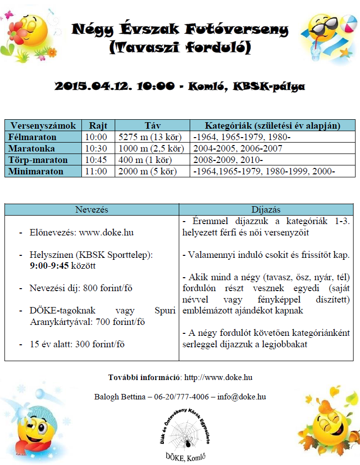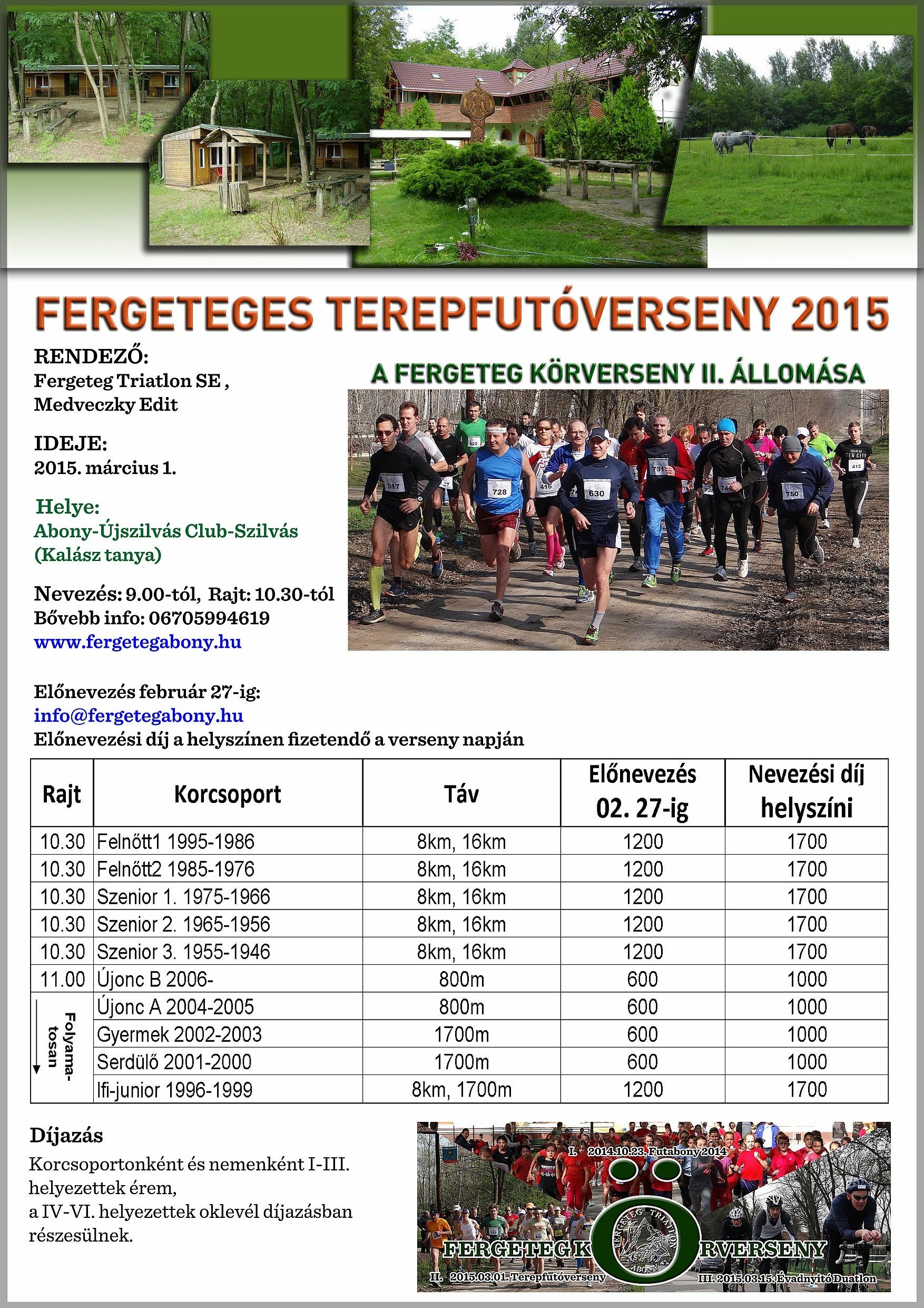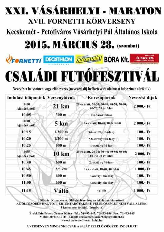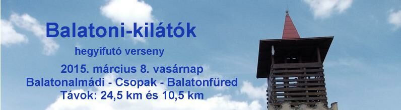 Március Már.01.szo. Nyúlcipőbolt Budai Trail - Telki 17,3-26,7km. kiírás eredmények Már.01.szo. Fergeteges Terepfutóverseny 2015 - Abony - R: Fergeteg Triatlon SE, 0,8-1,7-8-16km. kiírás eredmények Már.01.szo. Göcsej Galopp - Kávás 55-33-16-5km. kiírás eredmények Már.01.vas. Treviso maraton - Itália 42km. kiírás eredmények10. hét Már.06.pén. Szenior Fedettpályás Orsz.Bajn. - Budapest SYMA 0,06÷1,5km. kiírás eredmények Már.07.szo. Oxigén Kupa - terepfutóverseny - Debrecen - R: Oxigen (korosztályos) 1,5-2,5-5-10km. kiírás eredmények Már.07.szo. OptiVita Ultrafutó Kupa - Székesfehérvár R: IronTeam 2-4-6-12ó. kiírás eredmények Már.07.szo. Szigetfutás - Budapest - Margitsziget 5,3km. kiírás eredmények Már 07.szo. Pétfürdői Schmidt Ferenc Terepfutóverseny (45.) - R: Marathon TKE 0,8-5-10km. kiírás eredmények Már.08.vas. Balatoni Kilátók hegyifutó verseny (1.) - Balatonalmádi, Csopak- R: VBTSE 10,5-24,5km. kiírás eredmények Már.08.vas. Bükki kilátások (14.) terepfutás - Felsőtárkány - R: Egri Spartacus SE 44-66km. kiírás eredmények Már.08.vas. Pécs - Harkány - országúti futóverseny (31.) - R: PVSK - korosztályos, pénzdíjas 25km. kiírás eredmények Már.08.vas. Tavaszváró Terepfutóverseny - Naplás tó - nem korrekt időmérés 0,3-1-2-10km. kiírás eredmények 11.hét Már.14.szo. Auriga Erdei Futóverseny - Szolnok 0,2-1,6-3-5,5-11km. kiírás eredmények Már.14.szo. Futóverseny a Gyógyvizek Völgyében - Egerszalók 1,8-7,5-16,5km. kiírás eredmények Már.14.szo. I. Országfutás min.5km. kiírás nem mért Már.14.szo. OVER Pilis Vertikál - Pilisszántó - R: MVTE 6,5km. kiírás eredmények Már.14.szo. Országfutás Szentendrén kiírás eredmények Már.14.szo. Mezeifutó Országos Bajnokság - Kecskemét 3-4,5-6-10km. kiírás eredmények Már.14.szo. Pilis félmaraton és maraton - Piliscsaba - R: Piliscsabai Futrinkák 22-46km. kiírás eredmények Már.15.vas. Pilis-vörös-vár Terepfutó verseny - Pilisvörösvár - R: MVTE 39km. kiírás eredmények Már.15.vas. Vácrátót cross sík, homokos terepen (16.) - R: Futapest - korosztályos érem 4-12km. kiírás eredmények Már.15.vas. Barcelona maraton (15.) - utcai futóverseny - Spain 42km. kiírás eredmények Már.15.vas. Monaco Run (5.) - országúti szintes futóverseny - France 10-23km. kiírás eredmények 12. hét Már.17.ked. TTA Mezei Futóajnokság (9.) - Tápiószecső - R: TTA 1-1,5-2-3km. kiírás eredmények Már.19.÷22. SPURI Balaton szupermaraton (8.) - Siófok -R: BSI 195km. kiírás eredmények Már.19.-22. SPURI Balaton maratonok - R: BSI 48-52-44-50. kiírás eredmények Már.20.pén. SPURI Öböl Félmaraton 2015 - Keszthely - R: BSI 21km. kiírás eredmények Már.21.szo. Pusztazámor Kupa Futóverseny - R: Pilisi Pegazusok S.M.E 0,2-2-5km. kiírás eredmények Már.21.szo. Pesterzsébeti Futóklub: 6,4km futás - Budapest XX. ker 6,4km. kiírás eredmények Már.21.szo. SPURI FélBalaton szupermaraton 2015 - Badacsony - R: BSI 100km. kiírás eredmények Már.21.szo. SPURI MaratonFüred - Badacsonytomaj - R: BSI 42km. kiírás eredmények Már.22.vas. Duna menti Zöldsport Fesztivál - Vác - R: Zöldgömb (korosztályos) 2-5-10-21-30-42km. kiírás eredmények Már.22.vas. Dunaparti Futópartik - 1. forduló - aszfaltos töltésen - Esztergom 0,5-4-10km. kiírás eredmények Már.22.vas. Napfordulós világfutás - tavasz kiírás eredmények Már.22.vas. Roma maraton (21.) - utcai futóverseny - Italia 42km. kiírás eredmények 13. hét Már.28.szo. Budapest Nyílt Mezei Futóbajnokság / Szenior Mezei OB - Pólus Center 1,4-3-4-6-8km. kiírás eredmények Már.28.szo. Kisbéri ultramarathon (9.) - R: EMU 50-100km. kiírás eredmények Már.28.szo. Vásárhelyi Családi Futófesztivál (21.) utcákon - Kecskemét (koroszt.) 0,6-1-3-5-10-21km. kiírás eredmények Már.28.szo. Verőce crossfutás (15.) - R: Futapest 5-11km. kiírás eredmények Már.28.szo. Mérőmaraton Futóverseny (3.) - Kaposmérő 7-21km. kiírás eredmények Már.28.szo. Sárvár-fürdő félmaraton (18.) - R: Sárvári Kinizsi SE - Fut6sz Kupa 1. versenye 21km. kiírás eredmények Már.28.szo. Praga félmaraton - Csehország 21km. kiírás eredmények Már.29.vas. HOKA Eged-hegyi Terepfutás.(4.) - Eger 13,4km. kiírás eredmények Már.29.vas. Győrújbarát Terepfutás - R: Futóbarátok Egyesület 0,8-3-7-14km. kiírás eredmények Már.29.vas. Nyusziváró futóverseny! - Pétfürdő 0,05÷3km. kiírás eredmények Már.29.vas. Vértes Terep Maraton - R: Multinavigator.hu/Inov8 15-21-40-52km. kiírás eredmények Már.29.vas. Rotary Debrecen félmaraton - maraton (5.) - utcákon - R: DKM SE 10,5-21-42km. kiírás eredmények Már.29.vas. Novi Sad félmaraton (22.) - Szerbia 10-42km. kiírás eredmények Már.29.vas. Pozsony maraton - utcai futóverseny - Slovákia 21-42km. kiírás eredmények