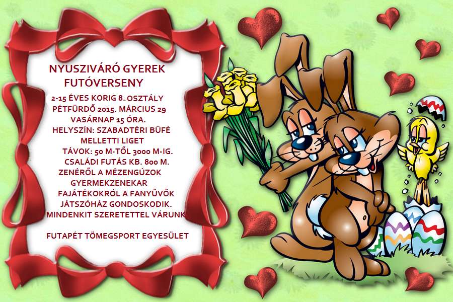 Április 14. hét Ápr.04.szo. Rákoscsabai Terepfutás - R: Futapest 4-12-21km. kiírás eredmények Ápr.04.szo. Domb futás - Kecskemét - R: Iustitia SE 0,8-3,5-7km. kiírás eredmények Ápr.04.szo. Szigetfutás - Budapest - Margitsziget 5,3km. kiírás eredmények Ápr.04.szo. PanoráMaraton (6.) - Sopron 14-28-42km. kiírás eredmények Ápr.05.vas. Tóparti Futóparti - Agárd 28km. kiírás nem mért Ápr.05.vas. Vertical 500 - terepfutás - Dömös 2,5km kiírás eredmények15. hét Ápr.06.hét. Bakonyi Zarándok futás (1.) - Bakonybél -Zirc - R: VBTSE 14,5km. kiírás eredmények Ápr.11.szo. Jótékonysági Futóverseny Gánton 3,5-7-14-21km kiírás eredmények Ápr.11.szo. Kikelet Félmaraton (5.) - sokféle talajon- Baja - R: MOGYI SE 12-21km. kiírás eredmények Ápr.11.szo Táltosfutás - Pécs (Pogány) 7km. kiírás eredmények Ápr.12.vas. Auriga Erdei Futóverseny - Szolnok 0,2-1,6-3-5,5-11km. kiírás eredmények Ápr.12.vas. Hód-Futófesztivál (1.) - Hódmezővásárhely - R: Hódiák SE, Hód-mentor SE 0,3-3,5-7-21km. kiírás eredmények Ápr.12.vas. Négy Évszak Futás tavaszi forduló - Komló - R: DÖKE 0,4-1-2-5,2km. kiírás eredmények Ápr.12.vas. PrémiumKupa pénzdíjas utcai futóverseny - Budapest - korosztályos 0,3-1,2-5,4-10km. kiírás eredmények Ápr.12.vas. Rock and Roll Futás (10.) - Vérteskozma 1-5-15km. kiírás eredmények Ápr.12.vas. Veresi Futófeszt - Veresegyház - korosztályos 0,8-2,5-5-10-21km. kiírás eredmények Ápr.12.vas. Milano maraton (15.) - utcai futóverseny - Italia 42km. kiírás eredmények Ápr.12.vas. Párizs maraton (39.)- utcai futóverseny - France 42km. kiírás eredmények Ápr.12.vas. Bécs maraton (32.) - Austria 21-42km. kiírás eredmények Ápr.12.vas. Rotterdam maraton (35.) - Hollandia 10-42km. kiírás eredmények 16.hét Ápr.18.szo Hajdúháti Hétmérföldes Futóünnep és Kráter Kupa Nagyhegyesen (2.) 0,5-1-1,5-3-13-21km. kiírás eredmények Ápr.18.szo Nyírerdő Futás - Debrecen 2,5-5-10km. kiírás eredmények Ápr.18.szo Mátrabérc Trail - Sirok/Szurdokpüspöki - R: BTBK 27-54km. kiírás eredmények Ápr.19.vas. Vivicitta félmaraton (5.) - Budapest - R: BSI 21km. kiírás eredmények Ápr.19.vas. Vivicitta futás (30.) - Budapest - R: BSI 10km. kiírás eredmények Ápr.19.vas. Midicitta futás (30.) - Budapest - R: BSI 7km. kiírás eredmények Ápr.19.vas. Zürich maraton (13.) - utcai futóverseny - Schweitz 42km. kiírás eredmények
