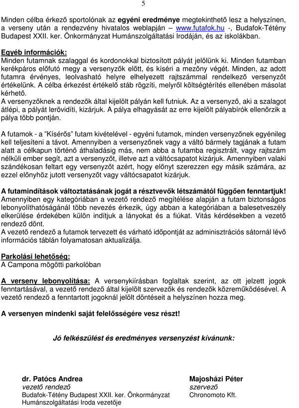 Október Okt.03.szo. Dél-alföldi Rotary Jótékonysági Futónap (2.) - Mórahalom 0,5-1,5-2,5-7-14-21km. kiírás eredmények Okt.03.szo. Futafok 2015 - kerületi futóverseny - Budapest 0,5-1-2-4,5km. kiírás eredmények Okt.03.szo. Pilis Trail - Piliscsaba 55km. kiírás eredmények Okt.03.szo. Ősfenyves futás - Fenyőfő 10-20km. kiírás eredmények Okt.03.szo. Rókaűzők - Váltófutóverseny (21.) - Kaposvár-Pécs 86km. kiírás eredmények Okt.03.szo. Szigetfutás - Budapest - Margitsziget 5,3km. kiírás eredmények Okt.03.szo. Zsámbéki Templomfutás és Családi Nap (7.) 0,5-1-1,4-6-10-20km. kiírás eredmények Okt.04.vas. Aradi Vértanúk Emlékfutás (8.) - Tarcal - (absz.serleg és koroszt. éremdij.) 1-5,5km. kiírás eredmények Okt.04.vas. Szüreti Félmaraton és egy hosszúlépés (1.) - Csongrád 0,4-2-10-23km. kiírás eredmények Okt.04.vas. ÍROTTKŐ hegyi futóverseny 18km. kiírás eredmények Okt.04.vas. Kanizsai Futófesztivál (10.) 5-10-21km. kiírás eredmények Okt.04.vas. Skyrun Hegyvidék - Budapest 2-4,5km. kiírás eredmények Okt.04.vas. Sri Chinmoy maraton, félmaraton (13.) - Győr 7-21-42km. kiírás eredmények Okt.04.vas. Kassa maraton (92.)- Slovakia (pénzdíjas, korosztályos.) 4,3-21-42km. kiírás eredmények 41. hét Okt.10.szo. Budapest 2015. Évi Gyermekbajnoksága 0,06÷3km. kiírás eredmények Okt.10.szo. No megállj csak - Nomád terepfutás - Cserépfalu 2,7-26-66km. kiírás eredmények Okt.11.vas. Kő-árok terepfutó verseny (2.) - Csesznek - R: VBTSE - korosztályos 13km. kiírás eredmények Okt.11.vas. SPAR Maraton (30.) - Budapest - R: BSI (korosztályos) 7-30-42km. kiírás eredmények Okt.11.vas. Szaggasd az aszfaltot (8.) - Bagod 0,5-3-10-21km. kiírás eredmények Okt.11.vas. Szenior Maraton Bajnokság = Spar Maraton - Budapest - R: BSI (korosztályos) 42km. kiírás eredmények Okt.11.vas. München maraton (30.) - Deutchland 10-21-42km. kiírás eredmények Okt.11.vas. Zagráb maraton (24.) - Croatis 5-21-42km. kiírás eredmények 42. hét Okt.17.szo. Fuss, hogy mi játszhassunk! - jótékonysági futás - Esztergom xkm. kiírás nem mért Okt.17.szo. OptiVita Ultrafutó Kupa - Velence - R: IronTeam 2-4-6ó-100km. kiírás eredmények Okt.17.szo. Oxigén Kupa - terepfutóverseny - Debrecen - R: Oxigen (korosztályos) 1,5-2,5-5-10km. kiírás eredmények Okt.17.szo. Patalom Félmaraton Futóverseny - Patalom 3-7-21km. kiírás eredmények Okt.17.szo. Várpalota félmaraton (22.) (pénzdíjas, korosztályos.) 4-10-21km. kiírás eredmények Okt.18.vas. Nyúlcipőbolt Bükk Trail - Miskolctapolca 15.6-36.1km. kiírás eredmények Okt.18.vas. Palotás cross (9.) - R: Futapest (korosztályos éremdíjazás) 4-13 km. kiírás eredmények Okt.18.vas. Sokorói Hegyifutás (21.) - Tényő 2-6-10,6km. kiírás eredmények Okt.18.vas. Szeged Nova Futónap (1.) 0,5-1-5-10km. kiírás nem mért Okt.18.vas. Garda tó maraton (9.) - Italia 42km. kiírás eredmények43. hét Okt.21.-23. Győr - Budapest Ultramaraton - országúti futóverseny - R: BBU 142km. kiírás eredmények Okt.23.pén. BBU Félmaraton - Budakeszi - R: BBU 21km. kiírás eredmények Okt.23.pén. Futabony 2015 (16.) - Abony - R: Fergeteg Triatlon SE 0,4-0,8-1-2-3km. kiírás eredmények Okt.23.-24. Trans Mátra - Galyatető Turistacentrum 23-48km. kiírás eredmények Okt.24.szo. 5K futás - Budapest XX. ker 5km. kiírás eredmények Okt.24.szo. Farkasszigeti Daruvonulás (2.) - Püspökladány 0,5-3,5-7-14-21-42km. kiírás eredmények Okt.24.szo. Mezei futó Magyar Liga és Amatör verseny 1. állomás - Békéscsaba - Póstelek 3-4-6-7km. kiírás eredmények Okt.24.szo. Pilisszentlászló crossfutás - R: Futapest (korosztályos éremdíjazás) 6-15km. kiírás eredmények Okt.25.vas. Bakony teteje hegyi félmaraton (2.) - Bakonybél - R: VBTSE - korosztályos 21km. kiírás eredmények Okt.25.vas. Dunaparti Futópartik - 5. forduló - aszfaltos töltésen - Esztergom 0,5-4-10km. kiírás eredmények Okt.25.vas. Halloween Futás (4.) - Debrecen- 17.00 óra - R: DKM SE 9km. kiírás eredmények Okt.25.vas. Barátság Maraton (14.) - Miskolc 5-10-21-42km. kiírás eredmények Okt.25.vas. Sárvári Vadkert Major terepfutó verseny (2.) 5-9-18km. kiírás eredmények Okt.25.vas. Frankfurt maraton (34.)- Deutchland 42km. kiírás eredmények Okt.25.vas. Velence maraton (30.) - Italia 10-42km. kiírás eredmények 44. hét Okt.26.hét. Dublin maraton (36.) - sík, utcai futóverseny - Ireland 42km. kiírás eredmények Okt.31.szo. OVER Piros terepfutás - Nagykovácsi - R: Magyar Vándorok TE 35-50-65-85km. kiírás eredmények Okt.31.szo. URH. 6 Órás Állóképességi Futás - Szeged 6ó. kiírás eredmények