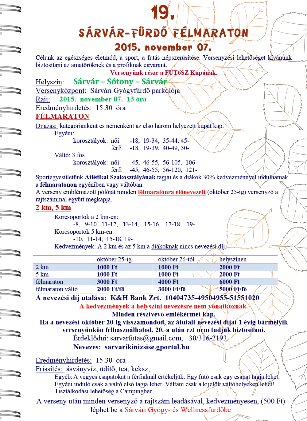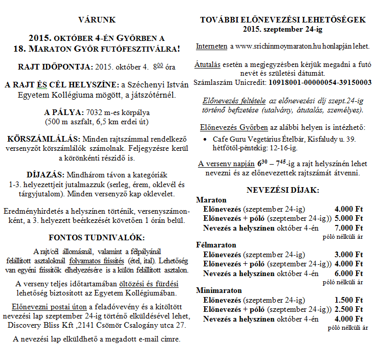 November Nov.01.vas. New York maraton - USA 42km. kiírás eredmények45. hét Nov.07.szo. BBU Halloween Run - Budapest 1-3,5-10km. kiírás eredmények Nov.07.szo. Intersport Túranap és Terepfutás (8.) - Csillaghegy - R: BSI 10-18-29km. kiírás eredmények Nov.07.szo. OptiVita Ultrafutó Kupa 2015 - 5.állomás - 6 órás OB 6ó. kiírás eredmények Nov.07.szo. Sárvár-Fürdő Félmaraton (19.) 2-5-21km. kiírás eredmények Nov.07.szo. Szigetfutás - Budapest - Margitsziget 5,3km. kiírás eredmények Nov.08.vas. Alkonyat negyedmaraton - Baja 10km. kiírás eredmények Nov.08.vas. Bakony Félmaraton (8.) - Csesznek - R: VBTSE - korosztályos éremdíjazás 20km. kiírás eredmények