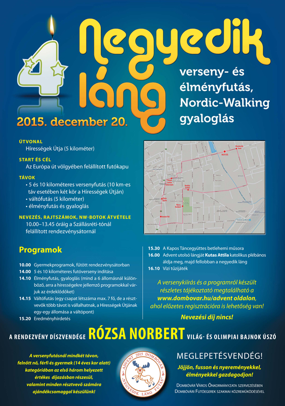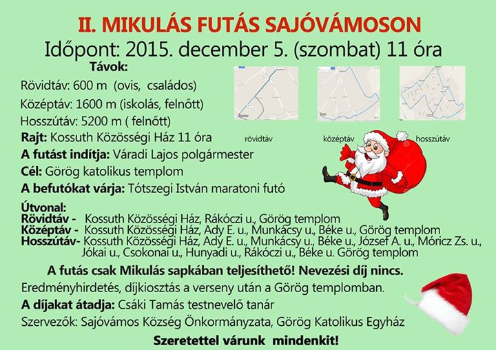 December 49. hét Dec.04.pén. Aquaticum Mikulás futás - Debrecen - R: DKM SE 1,5km. kiírás nem listás Dec.05.szo. Domb futás - Kecskemét - R: Iustitia SE 0,3-3,5km. kiírás eredmények Dec.05.szo. Mikulás Futás Sajóvámoson (2.) 0,6-1,6-5,2km. kiírás eredmények Dec.05.szo. Mikulásnapi Futóverseny (22.) - Pétfürdő 0,7-5-10km. kiírás eredmények Dec.05.szo. Oxigén Kupa - terepfutóverseny - Debrecen - R: Oxigen (korosztályos) 1,5-2,5-5-10km. kiírás eredmények Dec.05.szo. Szigetfutás - Budapest - Margitsziget 5,3km. kiírás eredmények Dec.05.szo. TESCO Mikulás Futás - Budapest - Polus Center - R: MAHFUSZ 0,5-1-2-4km. kiírás eredmények Dec.06.vas. Budaörsi Mikulás futás (1.) 0,5-2,5km. kiírás eredmények Dec.06.vas. Négy Évszak Futás téli forduló - Komló - R: DÖKE 0,4-1-2-5,2km. kiírás eredmények Dec.06.vas. Mikulás Futás és Túra (5.) - Sülysáp - R:TTA< 1,6-3,5-10,5km. kiírás eredmények Dec.06.vas. Mikulásfutás - Vác - korosztályos 5-11-21km. kiírás eredmények Dec.06.vas. Mikulás Futóverseny Szigetmonostoron - R: Pilisi Pegazusok 0,2-0,4-2,7-8km. kiírás eredmények Dec.06.vas. Lókúti Mikulás terepfutó verseny 2-5-10-20km. kiírás eredmények Dec.06.vas. Rossmann Mikulásfutás (2.) - Budapest - R: BSI 2,7km. kiírás nem mért Dec.06.vas. Stop-Mikulás futás (24.) - Tatabánya - R: Sprint 0,2-2-6km. kiírás eredmények Dec.06.vas. Szegedi Jótékonysági Félmaratont (1.) 1-10,5-21,1km. kiírás eredmények Dec.06.vas. Várkuti Hegyifutó Versenysorozat (23.) 1. verseny 2,5-5-10km. kiírás eredmények 50. hét Dec.13.vas. Nyúlcipőbolt Budai Trail Reloaded - Telki 17,3-26,7km. kiírás eredmények Dec.13.vas. Mogyoród terepfutás (9.) - R: Futapest - korosztályos éremdíjazás 5-13km. kiírás eredmények Dec.13.vas. Reggio Emilia maraton (20.) - Italia 42km. kiírás eredmények2000 | 2001 | 2002 | 2003 | 2004 | 2005 | 2006 | 2007 | 2008 | 2009 2010 | 2011 | 2012 | 2013 | 2014 | 2015 | 2016 | 2017 | 2018 | 2019 2020 | 2021 | 2022 | 2023 | 2024 | 2025 | 2026 | 2027 | 2028 | 202951. hét Dec.19.szo. Forralt bor futás (2.) - Budapest XX. 6,4km. kiírás eredmények Dec.20.vas. Bakonyi Karácsony Téli Félmaraton és Minimaraton - Porva - R: VBTSE 11,2-21km. kiírás eredmények Dec.20.vas. Karácsonyi rohanás (20.) - Győr - R: GyMS Megyei Szövetség (korcsoportos) 1,3-5-11km. kiírás eredmények