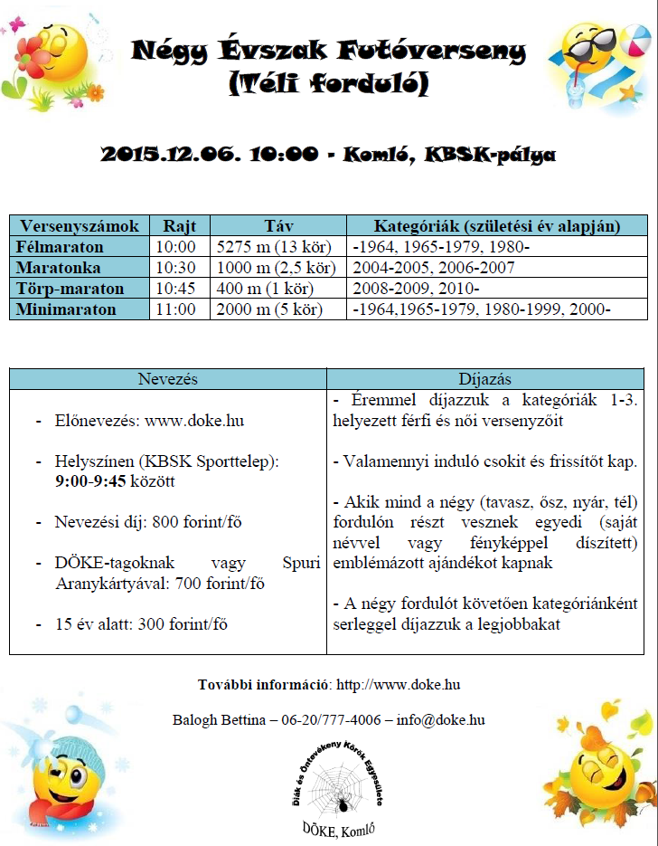Január 1. hét Jan.03.szo. 2015-ös Újévi Hídfutás - Békásmegyer - Ipartelep utca 9 óra kiírás nem listás Jan.03.szo. Szigetfutás - Budapest - Margitsziget 5,3km. kiírás eredmények Jan.04.vas. Gútai vízkereszt maraton (5.) és félmaraton(4.) - Szlovákia 21-42k. kiírás eredmények 2. hét Jan.06.ked. Háromkirályok Futóverseny - Kassa - Szlovákia 5km. kiírás eredmények Jan.11.vas. Szentendre crossfutás - R: Futapest - korosztályos éremdíjazás 4-12km. kiírás eredmények Jan.11.vas. Várkuti Hegyifutó Versenysorozat (22.) 2. verseny 2,5-5-10km. kiírás eredmények3. hét Jan.17.szo. Almádi Kupa (12.) - terepfutó verseny - Balatonalmádi - R: VBTSE 11km. kiírás eredmények Jan.17.szo. 6,4K futás - Budapest XX. ker 6,4km. kiírás eredmények Jan.17.szo. Mura Kupa futóversenyt (4.) - Murakeresztúr 2,6-5-10-21km. kiírás eredmények Jan.17.szo. Oxigén Kupa - terepfutóverseny - Debrecen - R: Oxigen (korosztályos) 1,5-2,5-5-10km. kiírás eredmények Jan.17.szo. Pesterzsébeti Futóklub: 6,4km futás - Budapest XX. ker 6,4km. kiírás nem listás Jan.18.vas. CITYRUN Félmaraton, utcai tájékozódási futóverseny - Budapest 10-21km. kiírás eredmények 4. hét Jan.25.vas. Etyek cross - R: Futapest - korosztályos éremdíjazás 4-13km. kiírás eredmények