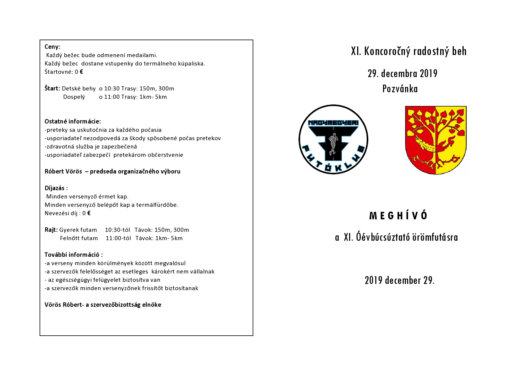 Január 01. hét Futónaptár térképe a heti versenyek rajthelyszíneihez Jan.05.szo. FUTAPEST TEREPFUTÁS - Budakalász - korosztályos ~ FUTAPEST ~ KUTYÁS FUTÁS 4,5-11,1km. kiírás eredmények Jan.05.szo. GÚTAI VÍZKERESZT MARATON, FÉLMARATON ÉS MARATONVÁLTÓ (9.) - Gúta / Szlovákia 21-42k. kiírás eredmények Jan.05.szo. SZIGETFUTÁS - Építők Margitszigeti Kajak Club - facebook ~ SZIGETFUTÁS SOROZAT 5,3km. kiírás eredmények Jan.05.szo. TÉLI CROSSFUTÁS 1. forduló - Hódmezővásárhely ~ TÉLI CROSSFUTÁS SOROZAT 3-6-12km. kiírás eredmények Jan.06.vas. HÁROMKIRÁLYOK FUTÓVERSENY - Kassa / Szlovákia 1,1-5km. kiírás eredmények 02. hét Futónaptár térképe a heti versenyek rajthelyszíneihez Jan.12.szo. KILENC KEVÉLY KÖR KARÁCSONY KÖRNYÉKÉN - Nagy-Kevély ~ ULTRAVERSENYEK 12ó. kiírás eredmények Jan.12.szo. MURA KUPA FUTÓVERSENY 2019 - Murakeresztúr - R: Kanizsai Futóklub 2,5-5-10-21km. kiírás eredmények Jan.12.szo. OXIGÉN KUPA - terepverseny - Debrecen - R: Oxigen ~ OXIGÉN KUPA 2018/19 1,5-2,5-5-10km. kiírás eredmények Jan.13.vas. GETE TRAIL 2.0 - Limited Winter Edition - Dorog / Gete-hegy - Dorogi Futókör SE 9km. kiírás eredmények Jan.13.vas. TÁRKÁNYI HEGYIFUTÓ VERSENYSOROZAT/3. - Felsőtárkány ~ 2019 TÉLI FORDULÓ 4,6-9,2-18,4km. kiírás eredmények Jan.13.vas. ZÚZMARA FÉLMARATON ÉS FUTÓFESZTIVÁL (4.) - Budapest - BSI ~ FÉLMARATONMÁNIA 5-10-21km. kiírás eredmények 03. hét Futónaptár térképe a heti versenyek rajthelyszíneihez Jan.19.szo. BUDAPEST FEDETTPÁLYÁS ATLÉTIKAI BAJNOKSÁGA - BOK Csarnok ~ SZENIOR 0,06÷3km. kiírás eredmények Jan.19.szo. FUTAPEST TEREPFUTÁS - Etyek - korosztályos ~ FUTAPEST ~ KUTYÁS FUTÁS 4,0-10,2km. kiírás eredmények Jan.19.szo. TÓTÁGAS ULTRA TÉLI BALATON KÖR (1.) - Balatonvilágos / Clubaliga ~ ULTRAVERSENYEK 197km. kiírás nem listás Jan.20.vas. KROKODILFUTÁS - terephendi Káposztásmegyeren - facebook ~ KROKODILFUTÁS 4,2-8,4-12,6km. kiírás eredmények Jan.20.vas. VIOLIN MARATON (3.) - Kecskemét ~ Bács-KisRun sorozat 2019 5-10,5-21km. kiírás eredmények 04. hét Futónaptár térképe a heti versenyek rajthelyszíneihez Jan.26.szo. TIHANY TRAIL - a téli terepfutás - Belső tó - R: Tihany Sport és Szabadidő Egy. 8-15km. kiírás eredmények Jan.26.-27. MAGYAR ATLÉTIKAI SZÖVETSÉG NYÍLT FEDETTPÁLYÁS VERSENYE - BOK Csarnok 0,06÷3km. kiírás eredmények Jan.26.szo. TÖRÖKBÁLINTI HENDIKEP - erdei verseny - Dióskert - R: TÉTE ~ TÖRÖKBÁLINT HENDI 5,3km. kiírás eredmények Jan.27.vas. ALMÁDI KUPA (16.) - Balatonalmádi - R: VBTSE - facebook ~ BAKONY TEREPFUTÓJA 11km. kiírás eredmények Jan.27.vas. NASZÁLY TRAIL - TÉLI BÖRZSÖNY - Zebegény - facebook - R: Ökofutás 15-29km. kiírás eredmények Jan.27.vas. WINTER TRAIL SPRINT 2019 - Tököli Parkerdő - R: Thebesttrailrunner.com 1-7-14km. kiírás eredményekFebruár 05. hét Futónaptár térképe a heti versenyek rajthelyszíneihez Feb.02.szo. SZIGETFUTÁS - Építők Margitszigeti Kajak Club - facebook ~ SZIGETFUTÁS SOROZAT 5,3km. kiírás eredmények Feb.02.szo. TAJGA TRAIL (4.) - esti terepverseny - Budakeszi - facebook 10-17,3km. kiírás eredmények Feb.02.szo. TÉLI CROSSFUTÁS 2. forduló - Hódmezővásárhely ~ TÉLI CROSSFUTÁS SOROZAT 3-6-12km. kiírás eredmények Feb.02.szo. TÉLI TEREP TERMÁL TOUR - 4T - Gébárti-tó, Zalaegerszeg 0,3-0,6-1,2-3-6-12km. kiírás eredmények Feb.02.szo. TÉLŰZŐ DOMB FUTÁS - Kecskemét - R: Iustitia SE ~ DOMB FUTÁSOK 0,8-3,5-10,6km. kiírás eredmények Feb.02.-03. MAGYAR ATLÉTIKAI SZÖVETSÉG NYÍLT FEDETTPÁLYÁS VERSENYE - BOK Csarnok 0,06÷3km. kiírás eredmények 06. hét Futónaptár térképe a heti versenyek rajthelyszíneihez Feb.09.szo. BELVÁROSI AKADÁLYFUTÁS - Kaposvár ~ AKADÁLYVERSENYEK 2-4km. kiírás eredmények Feb.09.szo. DÖGÖLJ MEG BÖRZSÖNY! ILLEGAL 2019 - Kemence - nem verseny! ~ ULTRAVERSENY 46km. kiírás nem listás Feb.09.szo. DRAGON ICE - téli akadályfutó verseny - Nyírbátor - fb ~ AKADÁLYVERSENYEK 1,5-5+10+km. kiírás eredmények Feb.09.szo. MARGITA TÉLI MARATON (13.) - Gödöllő - R: Margita 344,2 - koroszt. - facebook 21-40km. kiírás eredmények Feb.09.szo. OXIGÉN KUPA - terepverseny - Debrecen - R: Oxigen ~ OXIGÉN KUPA 2018/19 1,5-2,5-5-10km. kiírás eredmények Feb.09.szo. SZEDERKÉNY -> BÓLY 100KM FUTÁS - Szederkény - R: Futa-Pécs SE ~ ULTRAVERSENYEK 100km. kiírás eredmények Feb.10.vas. FUTAPEST TEREPFUTÁS - Kosd (1.) - korosztályos ~ FUTAPEST ~ KUTYÁS FUTÁS 6-12km. kiírás eredmények Feb.10.vas. KÉTEGYHÁZI VALENTIN NAPI ÖRÖMFUTÁS (5.) - Fő tér - facebook 0,4-0,8-5-10-21km. kiírás eredmények Feb.10.vas. KOMÉTA FARSANGI FÉLMARATON (9.) - Kaposvár - facebook ~ ATOMFUTÁS 21km. kiírás eredmények Feb.10.vas. TÁRKÁNYI HEGYIFUTÓ VERSENYSOROZAT/3. - Felsőtárkány ~ 2019 TÉLI FORDULÓ 4,6-9,2-18,4km. kiírás eredmények 07. hét Futónaptár térképe GPS koordinátákkal a heti versenyek rajthelyszíneihez Feb.16.szo. FUT-ISASZEG FARSANGJA (1.) - Isaszeg 2-5-10km. kiírás eredmények Feb.16.szo. HKR FUSS KUTYÁDDAL - terepfutó verseny - Kisoroszi - R: HKR ~ KUTYÁS 1,5+3+6+km. kiírás eredmények Feb.16.szo. NÉGY ÉVSZAK MARATON - Pusztaszabolcs - R: PSZE ~ Négy Évszak Maraton Sorozat 10,6km. kiírás eredmények Feb.16.-17. MAGYARORSZÁG FEDETTPÁLYÁS ATLÉTIKAI BAJNOKSÁGA - BOK Csarnok 0,06÷3km. kiírás eredmények Feb.17.vas. KROKODILFUTÁS - terephendi Káposztásmegyeren - facebook ~ KROKODILFUTÁS 4,2-8,4-12,6km. kiírás eredmények Feb.17.vas. SEVILLA MARATON (35.) - utcai futóverseny - Spain (pénzdíjas) 42km. kiírás eredmények Feb.17.vas. SZERELMES FÜRED (4.) - páros utcai futóverseny - Balatonfüred - facebook 7-2*7km. kiírás eredmények Feb.17.vas. TÉLI CROSSFUTÁS 3. forduló - Hódmezővásárhely ~ TÉLI CROSSFUTÁS SOROZAT 3-6-12km. kiírás eredmények Feb.17.vas. TÜNDÉR HEGYI TEREPFUTÓ VERSENY (6.) - Vilony