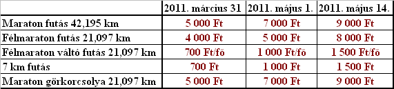 A nevezési díj összege változó, azon időponttól (naptól) függ, melyen a nevezési díj ráfut a rendező számlájára, illetve készpénzes vagy bankkártyás fizetés esetén az napi díj érvényes, amelyen ki lett fizetve!